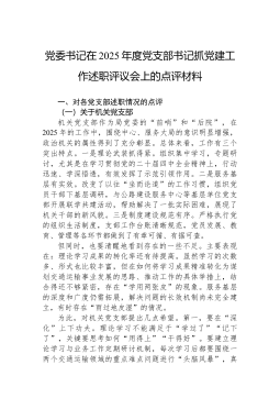 党委书记在2025年度党支部书记抓党建工作述职评议会上的点评材料一、对各党支部述职情况的点评(一)关于机关党支部机关党支部作为局党委的“前哨”和“后院”,在2025年的工作中,围绕中心、服务大局的意识明显增强,政治机关的属性得到了充分彰显。总体来看,工作有三个突出特点。一是理论武装抓得紧。组织集中学习,专题研讨,尤其是在学习贯彻党的二十届四中全会精神上,行动迅速、学深悟透,有效发挥了示范引领作用。二是服务基层有实效。改变了以往“坐而论道”的工作习惯,组织党员干部下基层调研,与公路建设服务中心等基层单位党支部开展联学共建活动,帮助解决了一批实际困难,展现了机关干部的新风貌。三是制度建设规范有序。严格执行党的组织生活制度,支部工作台账清晰规范,党员发展、教育、管理等各环节都做到了有章可循、有据可...