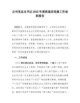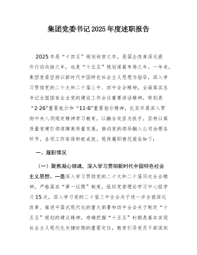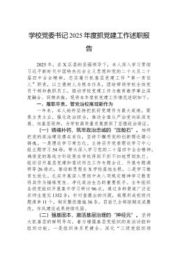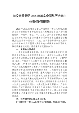 学校党委书记2025年落实全面从严治党主体责任述职报告2025年,我认真履行全面从严治党第一责任人职责,坚持以习近平新时代中国特色社会主义思想为指导,深入学习贯彻党的二十大和二十届二中、三中、四中全会精神,贯彻落实习近平总书记视察山东重要讲话和视察枣庄重要指示精神,落实区委十一届七次、八次、九次全会部署和区纪委五次全会精神,扎实开展深入贯彻中央八项规定精神学习教育,推动清廉学校建设。现将履责情况报告如下:一、主要做法及成效一是抓政治建设强引领。坚持把政治建设摆在首位,组织班子成员和全体党员学习党的二十届四中全会精神及习近平总书记视察山东重要讲话精神12次,开展"第一议题"学习18次。严格执行民主集中制,全年召开党支部委员会16次,"三重一大"事项全部集体研究决定。扎实开展深入贯彻中央八项规定...