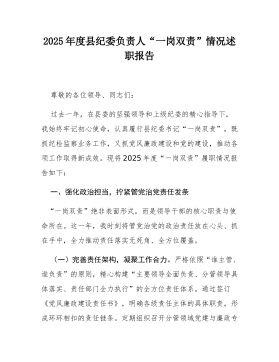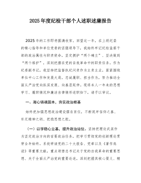 2025年度纪检干部个人述职述廉报告2025年的工作即将圆满收官。回望这一年,在上级纪委的精心指导和单位党委的坚强领导下,我始终牢记纪检监察干部的政治属性与职责使命,坚定拥护“两个确立”、坚决做到“两个维护”,深刻把握在党的自我革命中的职责任务。作为纪委副书记,我坚持把监督执纪问责作为主责主业,紧紧围绕单位中心工作和发展大局,忠诚履职、担当作为,努力推动全面从严治党向纵深发展、向基层延伸。现将本人一年来的思想学习、履职情况和廉洁自律情形述职如下,请予以审议。一、凝心铸魂固本,夯实政治根基始终把加强思想政治建设摆在首位,不断筑牢信仰之基、补足精神之钙、把稳思想之舵。(一)以学稳心立基,提升政治站位。坚持把理论武装作为坚定政治方向的首要政治任务,把学习贯彻党的创新理论贯穿全年始终。系统研读党的二...