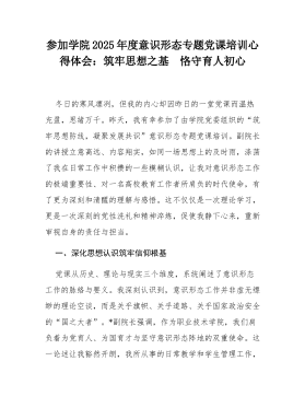 参加学院2025年度意识形态专题党课培训心得体会:筑牢思想之基恪守育人初心冬日的寒风凛冽,但我的内心却因昨日的一堂党课而温热充盈,思绪万千。昨天,我有幸参加了由学院党委组织的“筑牢思想防线,凝聚发展共识”意识形态专题党课培训。副院长的讲授立意高远、内容翔实,如同一场思想上的及时雨,涤荡了我在日常工作中积攒的一些模糊认识,让我对意识形态工作的极端重要性、对一名高校教育工作者所肩负的时代使命,有了更为深刻和清醒的理解与感悟。这不仅仅是一次理论学习,更是一次深刻的党性洗礼和精神淬炼,促使我静下心来,重新审视自身的责任与担当。一、深化思想认识筑牢信仰根基党课从历史、理论与现实三个维度,系统阐述了意识形态工作的脉络与要义。我深刻认识到,意识形态工作并非虚无缥缈的理论空谈,而是关乎旗帜、关乎道路、关乎国...