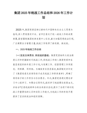 集团2025年统战工作总结和2026年工作计划2025年,集团党委坚持以新时代中国特色社会主义思想为指导,深入贯彻落实中央、省市区委关于统一战线工作的决策部署,紧密围绕集团改革发展中心任务,着力加强思想政治引领,广泛凝聚各方智慧力量,统战工作取得了新进展、新成效。一、2025年统战工作总结(一)压实主体责任,夯实组织基础。集团党委始终从政治高度认识和把握新时代统战工作,将统战工作纳入集团党委和各基层党组织的年度工作计划,与党建工作、经营管理工作同谋划、同部署、同考核。为确保责任层层落实,集团制定并印发了《集团党委及其领导班子成员统战工作职责清单》,明确了领导班子的工作责任与任务要求。年内,集团党委通过理论学习中心组学习、专题会议等形式,组织学习统战理论政策x次,并结合*区委统战部举办的各类培...