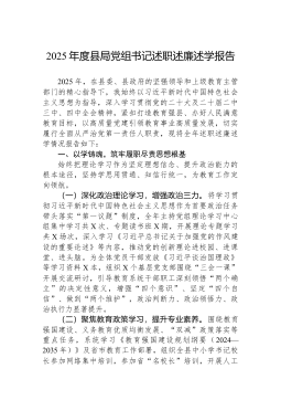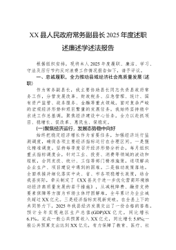 XX县人民政府常务副县长2025年度述职述廉述学述法报告根据组织安排,现将本人2025年度履职、廉洁、学习、守法及厉行节约反对浪费工作情况报告如下,请予评议。一、忠诚履职,全力推动县域经济社会高质量发展(述职)作为常务副县长,我主要协助县长同志负责县政府常务工作,分管发展改革、财政税务、应急管理、统计、国有资产监管、政务服务、金融等重点领域。面对复杂严峻的宏观经济形势和艰巨繁重的发展任务,我始终坚持稳中求进工作总基调,聚焦经济建设中心任务,全力以赴抓项目、稳增长、促改革、惠民生、保稳定。(一)聚焦经济运行,发展态势稳中向好始终把稳定经济增长作为首要任务,加强经济运行监测调度,确保各项主要经济指标运行在合理区间。一是强化精准调度。坚持每季度召开经济形势分析会,每月组织重点指标调度会,针对工业、...