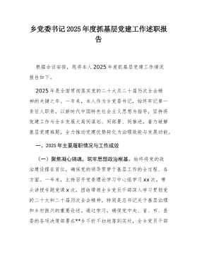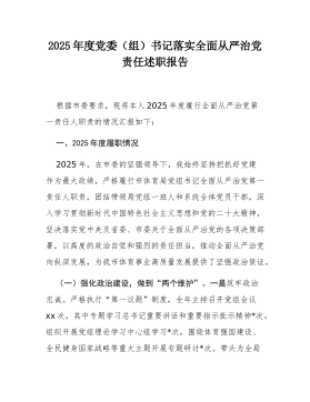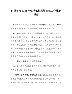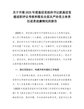 关于开展2025年度基层党组织书记抓基层党建述职评议考核和落实全面从严治党主体责任述责述廉情况的报告2025年,局坚持以新时代中国特色社会主义思想为指导,深入学习贯彻党的二十大精神,全面落实新时代党的建设总要求,紧扣党中央关于推进全面从严治党向基层延伸的决策部署,牢牢把握“书记抓、抓书记”这一关键环节,扎实开展基层党组织书记抓基层党建述职评议考核和落实全面从严治党主体责任述责述廉工作,切实把管党治党政治责任扛在肩上、抓在手上、落在实处,推动全系统党建工作质量持续提升,为各项事业高质量发展提供坚强政治保障。一、强化顶层设计,构建齐抓共管的工作格局(一)坚持高位推动,压实主体责任。局党组始终把开展述职评议考核和述责述廉作为履行管党治党政治责任的重要抓手,列入年度党建工作重点任务,专题研究部署。年...