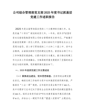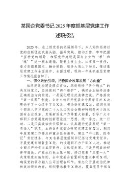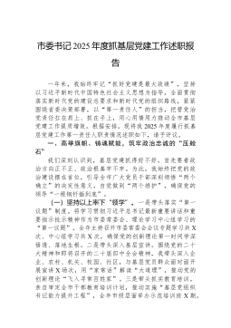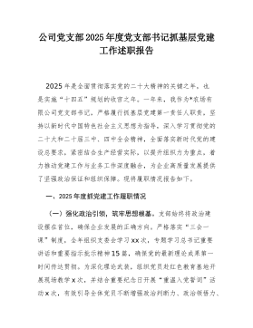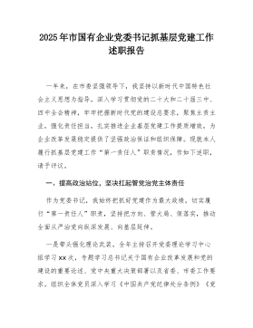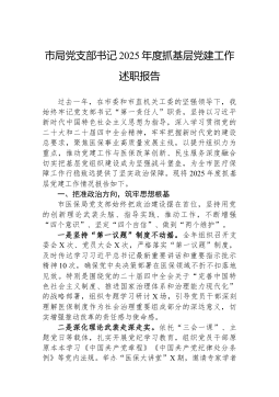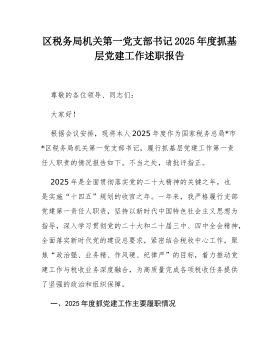区税务局机关第一党支部书记2025年度抓基层党建工作述职报告尊敬的各位领导、同志们:大家好!根据会议安排,现将本人2025年度作为国家税务总局*市*区税务局机关第一党支部书记,履行抓基层党建工作第一责任人职责的情况报告如下。不当之处,请批评指正。2025年是全面贯彻落实党的二十大精神的关键之年,也是实施“十四五”规划的收官之年。一年来,我严格履行支部党建第一责任人职责,坚持以新时代中国特色社会主义思想为指导,深入学习贯彻党的二十大和二十届三中、四中全会精神,全面落实新时代党的建设总要求,紧密结合税收中心工作,聚焦“政治强、业务精、作风硬、纪律严”的目标,着力推动党建工作与税收业务深度融合,为高质量完成各项税收任务提供了坚强的政治和组织保障。一、2025年度抓党建工作主要履职情况(一)聚焦政治...