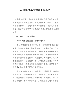 xx镇年度基层党建工作总结今年来,在区委、区政府的正确领导下,镇党委坚持以习近平重要系列讲话为指导,全面贯彻党的二十大、二十届四中全会精神,以习近平新时代中国特色社会主义思想为指导,紧密结合全镇中心工作,现将党建工作主要情况总结如下:一、xx年工作总结情况(一)凝聚思想力量,强化政治自觉一是认真贯彻落实中央和省、市、区委党建工作的相关部署,切实明确党建工作重点任务,严格执行党建工作各项制度,突出抓好习近平总书记系列重要讲话精神的学习,突出抓好突出抓好党内政治生活的开展,教育引导全镇党员干部牢固树立理想信念、规矩意识、大局意识,进一步增强党性原则、担当精神,进一步增强做好党建工作的使命感和责任感,积极主动做好思想政治工作,切实凝聚思想力量,推进我镇党建工作落实到位。二是以学习教育为契机,知行合...
