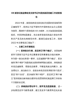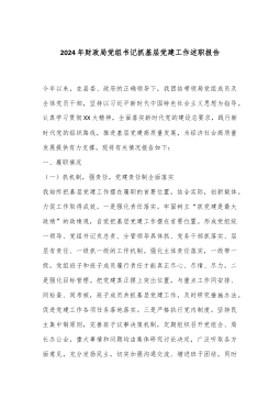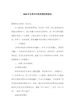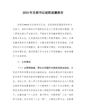 公司党支部书记2024年度落实党建工作责任制述职报告尊敬的各位领导、同志们:大家好!2024年,在上级党组织的正确领导下,我作为公司党支部书记,始终坚持以新时代中国特色社会主义思想为指导,认真履行党建工作第一责任人职责,团结带领公司全体党员干部职工,扎实推进党建各项工作,为公司的稳定发展提供了坚强的政治保障和组织保障。现将本人2024年度落实党建工作责任制情况述职如下:一、主要工作及成效(一)强化政治引领,筑牢思想根基。始终把政治建设摆在首位,教育引导全体党员干部增强“四个意识”、坚定“四个自信”、做到“两个维护”。通过组织党员集中学习、专题研讨、个人自学等多种形式,深入学习贯彻新时代中国特色...
