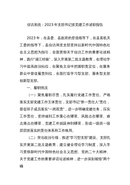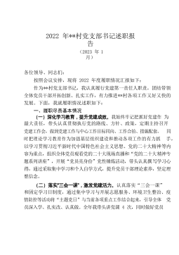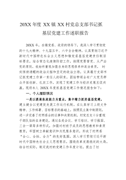 20XX年度XX镇XX村党总支部书记抓基层党建工作述职报告20XX年,在镇党委、政府的领导下,我深入学习贯彻党的十九大精神、十九届五中、六中全会精神,认真贯彻习近平新时代中国特色社会主义思想和镇党委基层党建责任制目标要求,结合常态化疫情防控工作,按照党要管党、从严治党的原则,我始终重视加强自身的思想修养和政治素质,时刻保持清醒的政治头脑和坚定的政治立场,认真履行支部书记抓党建工作第一责任人的职责,团结带领全村广大党员群众开拓创新、扎实工作,实现了党建工作与经济发展互促共赢。现将本人20XX年度抓基层党建工作情况报告如下:一、个人履职情况一是以提高执政能力为重点,集中精力抓好基层党建。建立健全以...