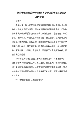 旗委书记在旗委议军会暨苏木乡镇党委书记述职会议上的讲话同志们:今年以来,旗人武部和驻太军警部队坚持以习近平新时代中国特色社会主义思想为指导,深入学习贯彻习近平强军思想,坚决执行党中央和中央军委各项决策部署,在深化改革、思想教育、练兵备战、国防动员、双拥共建等方面取得了新的进步,在支援地方经济建设和疫情防控、应急处突、抢险救灾等急难险重任务中发挥了重要作用。在此,我代表旗委、政府和全旗各族群众,向人武部和驻太军警部队广大官兵、文职人员、干部职工以及民兵预备役人员,表示衷心的感谢!2023年是贯彻落实党的二十大精神开局之年,大事多要事多,做好新形势下党管武装工作,意义重大、责任重大。各苏木乡镇各部...