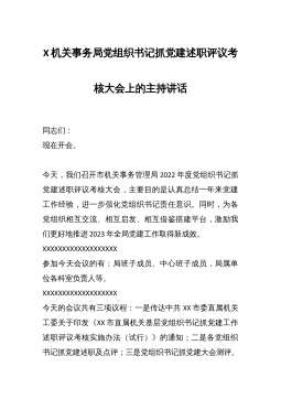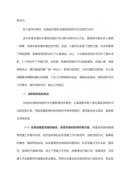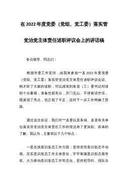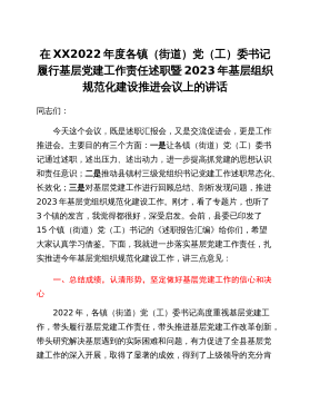 在XX2022年度各镇(街道)党(工)委书记履行基层党建工作责任述职暨2023年基层组织规范化建设推进会议上的讲话同志们:今天这个会议,既是述职汇报会,又是交流促进会,更是工作推进会。主要目的有三个方面:一是让各镇(街道)党(工)委书记通过述职,述出压力、述出动力,进一步提高抓党建的思想认识和责任意识;二是推动县镇村三级党组织书记党建工作述职常态化、长效化;三是对基层党建工作进行回顾总结、剖析发现问题,推进2023年基层党组织规范化建设工作。刚才,看了专题片,也听了3个镇的发言,我觉得都很好,深受启发。会前,县委已印发了15个镇(街道)党(工)书记的《述职报告汇编》给你们,希望大家认真学习借鉴...