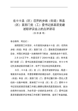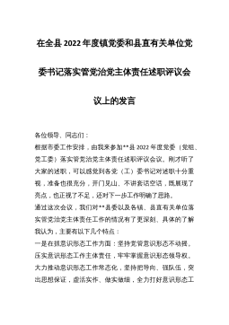 在全县2022年度镇党委和县直有关单位党委书记落实管党治党主体责任述职评议会议上的发言各位领导、同志们:根据市委工作安排,由我来参加**县2022年度党委(党组、党工委)落实管党治党主体责任述职评议会议。刚才听了大家的述职,可以感觉到各党(工)委书记对述职十分重视,准备也很充分,开门见山、不讲套话空话,既展现了亮点,也正视了不足,还对下一步工作明确了思路。通过这次会议,我们对**县委以及各镇、县直有关单位落实管党治党主体责任工作的情况有了更深刻、具体的了解我认为,主要有以下几个特点:一是在抓意识形态工作方面:坚持党管意识形态不动摇。压实意识形态工作主体责任,牢牢掌握意识形态领导权。大力推动意识...