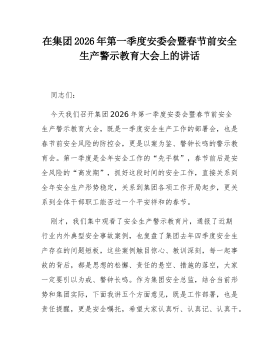 在集团2026年第一季度安委会暨春节前安全生产警示教育大会上的讲话同志们:今天我们召开集团2026年第一季度安委会暨春节前安全生产警示教育大会,既是一季度安全生产工作的部署会,也是春节前安全风险的防控会,更是以案为鉴、警钟长鸣的警示教育会。第一季度是全年安全工作的“先手棋”,春节前后是安全风险的“高发期”,抓好这段时间的安全工作,直接关系到全年安全生产形势稳定,关系到集团各项工作开局起步,更关系到全体干部职工能否过一个平安祥和的春节。刚才,我们集中观看了安全生产警示教育片,通报了近期行业内外典型安全事故案例,也复盘了集团去年四季度安全生产存在的问题短板,这些案例触目惊心、教训深刻,每一起事故的背后,都是思想的松懈、责任的悬空、措施的落空,大家一定要引以为戒、警钟长鸣。作为集团安全总监,结合当...