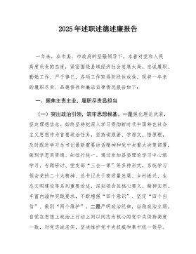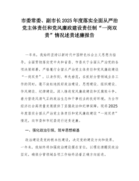 市委常委、副市长2025年度落实全面从严治党主体责任和党风廉政建设责任制“一岗双责”情况述责述廉报告一年来,我始终坚持以新时代中国特色社会主义思想为指导,全面贯彻落实党中央和省委、市委关于全面从严治党的各项决策部署,严格履行全面从严治党主体责任和党风廉政建设“一岗双责”,以身作则、率先垂范,在抓好分管领域业务工作的同时,毫不放松地抓好政治建设、思想建设、组织建设、作风建设、纪律建设,深入推进党风廉政建设和反腐败斗争,着力营造风清气正的政治生态和干事创业的良好环境,为全市经济社会高质量发展提供了坚强政治和纪律保障。现将2025年度落实全面从严治党主体责任和党风廉政建设“一岗双责”情况,向市委和市纪委进行述责述廉。一、强化政治引领,筑牢思想根基政治建设是党的根本性建设,决定党的建设方向和效果。一...