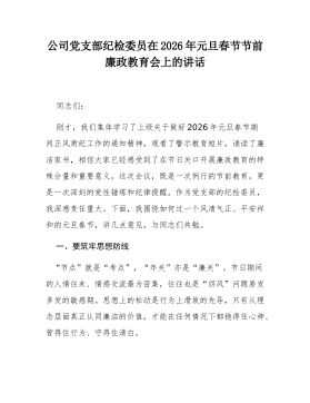 公司党支部纪检委员在2026年元旦春节节前廉政教育会上的讲话同志们:刚才,我们集体学习了上级关于做好2026年元旦春节期间正风肃纪工作的通知精神,观看了警示教育短片,诵读了廉洁家书,相信大家已经感受到了在节日关口开展廉政教育的特殊分量和重要意义。这次会议,既是一次例行的节前教育,更是一次深刻的党性锤炼和纪律提醒。作为党支部的纪检委员,我深感责任重大。下面,我围绕如何过一个风清气正、平安祥和的元旦春节,讲几点意见,与同志们共勉。一、要筑牢思想防线“节点”就是“考点”,“年关”亦是“廉关”。节日期间的人情往来、情感交流最为密集,往往也是“四风”问题易发多发的敏感期。思想上的松动是行为上滑坡的先导,只有从理念层面真正认同廉洁的价值,才能在任何情况下都稳得住心神、管得住行为、守得住清白。(一)要深悟...