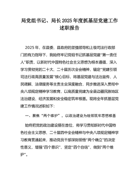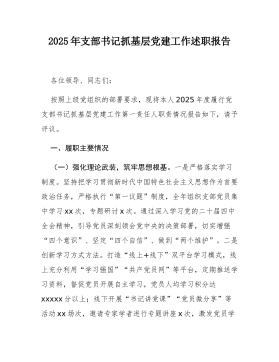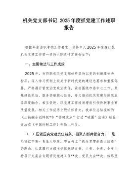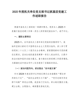 市委社会工作部机关支部委员会书记2025年度抓党建工作述职报告尊敬的市委领导、各位同志:根据市委统一部署和要求,现将本人2025年度履行机关党支部抓党建工作第一责任人职责情况汇报如下。过去一年,在市委的坚强领导和部务会的直接指导下,我始终牢记党支部书记的职责使命,坚持把抓好党建作为最大政绩,紧紧聚焦“围绕中心、建设队伍、服务群众”的核心任务,以高度的政治自觉和行动自觉,团结带领支部全体党员,积极探索机关党建与新时代社会工作深度融合、协同发展的有效路径,着力推动机关党建工作提质增效,为我市社会工作高质量发展提供了坚强的政治保证和组织保障。一、主要做法与工作成效一年来,我始终将党建工作置于首要位置,坚持“抓书记、书记抓”,认真履行第一责任人职责,以系统思维谋划推进机关党的各项建设,重点在“领航”...