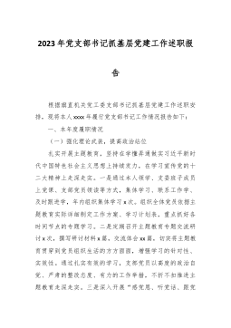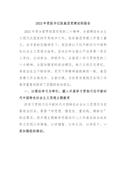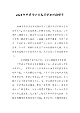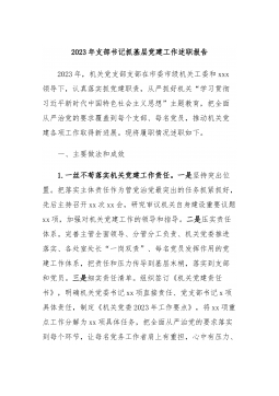 2023年度区财政局党总支书记抓基层党建工作述职报告 一年来,在区委区政府的正确领导下,区财政局总支切实履行党建工作第一责任人的职责,团结带领全局干部职工,深入学习贯彻党的二十大精神,坚持以习近平新时代中国特色社会主义思想为指导,紧紧围绕基层党建工作责任清单,深入推进基层党组织建设,不断提高财政局党组织的凝聚力和战斗力,为全区财政工作健康发展提供了坚强保障。 一、2023年基层党建主要成绩及经验 (一)认真履行职责,带头落实党建工作责任制。局总支始终坚持把抓好党建工作放在首位,明确第一责任人职责,做到立足实际、思虑周全,带头示范、严肃执行。牢牢把握深入学习贯彻习近平新时代中国特色社会主义...