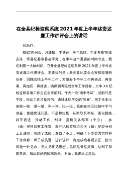 在全县纪检监察系统2021年度上半年述责述廉工作讲评会上的讲话同志们:按照“周例会、月通报、季讲评、半年总结、年度考核”制度安排,经县纪委常委会研究,在半年这个重要的时间节点,我们利用一大晌时间,召开全县纪检监察系统2021年度上半年述责述廉工作讲评会。主要目的是:聚焦县纪委全会安排部署的任务,回顾总结上半年工作,对做好下半年工作再动员、再部署、再加压、再推进,确保圆满完成全年工作目标,力争XX纪检监察各项工作走在全市前列。作为一次“期中考试”,述职只是手段,推动工作才是目的。通过述职所交的“答卷”,把工作拿出来晾一晾、晒一晒、评一评、比一比,既能在相互比较中学习借鉴,更能发现问题、不足和短板...