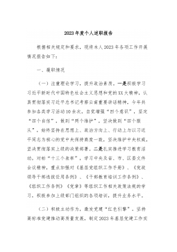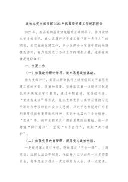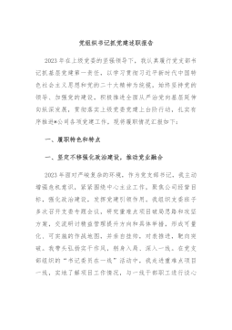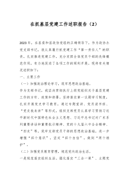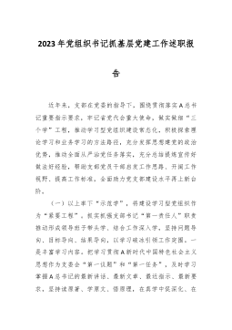 2023年党组织书记抓基层党建工作述职报告 近年来,支部在党委的指导下,围绕贯彻落实习近平总书记重要指示要求,牢记省党代会重大使命,做实做细“三个学”工程,推动学习型党组织建设常态化,积极探索理论学习和业务学习的方法路径,充分发挥思想建党的政治优势,推动全面从严治党任务落实,充分总结提炼宣传好做法好经验,帮助支部党员干部启发工作思路、开阔工作视野、提高工作标准,全面助力党支部建设水平再上新台阶。 (一)以上率下“示范学”,将建设学习型党组织作为“紧要工程”。抓实抓强支部书记“第一责任人”职责推动形成领导班子带头学、结合工作深入学,坚持问题导向、目标导向、结果导向,以学习破冰引领工作突围。一是丰...