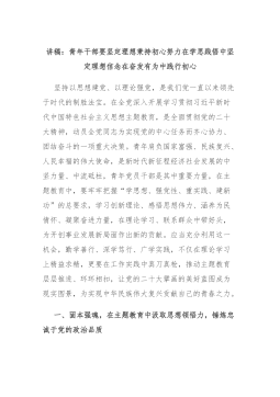 讲稿:青年干部要坚定理想秉持初心努力在学思践悟中坚定理想信念在奋发有为中践行初心坚持以思想建党、以理论强党,是我们党一直以来领先于时代的制胜法宝。在全党深入开展学习贯彻习近平新时代中国特色社会主义思想主题教育,是全面贯彻党的二十大精神,动员全党同志为实现党的中心任务而齐心协力、团结奋斗的一项重大决策。青年肩负国家富强、民族复兴、人民幸福的伟大使命,是新时代新征程经济社会发展的中坚力量、中流砥柱,青年党员干部是其中重要力量,在主题教育中,要牢牢把握“学思想、强党性、重实践、建新功”的总要求,学习创新理论、感悟思想伟力、涵养为民情怀、凝聚奋进力量,在理论学习、联系群众中带好头,为开创事业发展新局面...