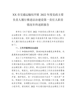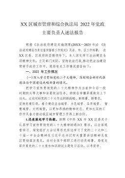 XX区城市管理和综合执法局2022年党政主要负责人述法报告根据《法治政府建设实施纲要(20XX—2025年)》《法治政府建设与责任落实督察工作规定》及省、市、区工作部署,在XX区委、区政府的坚强领导下,本人深化学习法治建设各项精神文件,立足部门实际,坚持依法行政,推动把法治建设贯穿于政府工作中,现将有关工作情况报告如下:一、2022年工作情况(一)深入学习贯彻党的二十大精神,深刻领会新时代推进法治中国建设战略部署的情况。把学习宣传贯彻党的二十大精神作为当前和今后一段时期的头等大事和首要政治任务,持续在学懂弄通做实上下功夫,主动对标党的二十大作出的新战略、新部署、新要求,坚持党建引领,着力建设法...