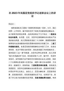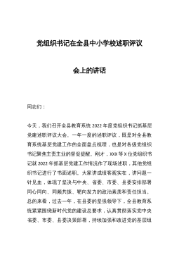 在全县中小学校2022年党组织书记述职评议会上的讲话同志们:今天,我们召开全县教育系统2022年度党组织书记抓基层党建述职评议大会。一年一度的述职评议,既是对全县教育系统基层党建工作的全面盘点梳理,也是对各级党组织书记聚焦主责主业的督促提醒。刚才,XXX等X位党组织书记就2022年抓基层党建工作情况作了现场述职,其他党组织书记进行了书面述职。大家讲成绩客观实在,讲问题一针见血,体现了坚决与中央、省委、市委、县委安排部署同心同向、同频共振、靶向发力的政治素质和责任担当。总的来看,过去一年,在县委的坚强领导下,全县教育系统紧紧围绕新时代党的建设总要求,认真贯彻落实党中央、省委、市委、县委决策部署,...