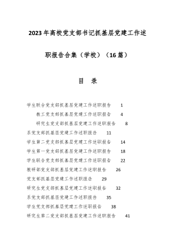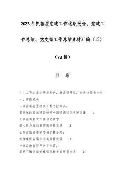 2023年抓基层党建工作述职报告、党建工作总结、党支部工作总结素材汇编(五)(73篇)目 录注:以下文章公开发表时,就是摘要版,会员也没有全文一、省级机关云南省委省直机关工委书记邱江:坚持党的政治建设统领全面提高机关党建质量 1云南省委教育工委书记杨宁:凝心聚力推动教育高质量发展 2云南省国资委党委书记黄小荣:抓党建促省属企业高质量发展 3云南省教育厅厅长王云霏:坚持不懈抓实党建引领教育高质量发展 4云南省人民政府研究室党组书记杨建林:提高机关党建质量担当以文辅政职责使命 5云南省体育局党组书记杨中华:党建引领开新局,体育强省展新篇 6云南省滇中引水建管局党组书记刘加喜:红色引擎驱...