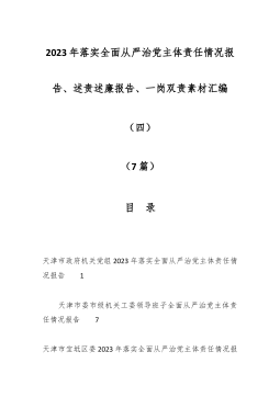 2023年落实全面从严治党主体责任情况报告、述责述廉报告、一岗双责素材汇编(五)(11篇)目 录宁河区委领导班子2023年度履行全面从严治党主体责任情况报告 1滨海新区委领导班子2023年度落实全面从严治党主体责任情况报告 11河东区委2023年落实全面从严治党主体责任情况报告24天津市统计局领导班子2023年落实全面从严治党主体责任情况报告 26天津市卫健委党委班子2023年度履行全面从严治党主体责任情况报告……35天津市工业和信息化局党组2023年落实全面从严治党主体责任情况报告…44天津市规划资源局领导班子2023年度落实全面从严治党主体责任报告……49市第一中级人民法院2023年...