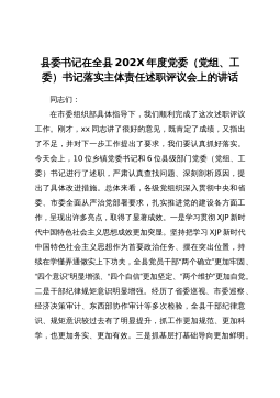 县委书记在全县202X年度党委(党组、工委)书记落实主体责任述职评议会上的讲话同志们:在市委组织部具体指导下,我们顺利完成了这次述职评议工作。刚才,xx同志讲了很好的意见,既肯定了成绩,又指出了不足,并对下一步工作提出了要求,我们要认真抓好落实。今天会上,10位乡镇党委书记和6位县级部门党委(党组、工委)书记进行了述职,严肃认真查找问题、深刻剖析原因,提出了具体改进措施。总体来看,各级党组织深入贯彻中央和省委、市委全面从严治党部署要求,扎实推进党的建设各方面工作,呈现出许多亮点,取得了显著成效。一是学习贯彻XJP新时代中国特色社会主义思想成效更加突显。坚持把学习XJP新时代中国特色社会主义思想...