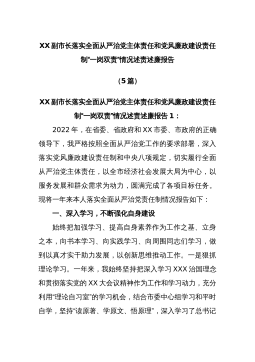 XX副市长落实全面从严治党主体责任和党风廉政建设责任制“一岗双责”情况述责述廉报告(5篇)XX副市长落实全面从严治党主体责任和党风廉政建设责任制“一岗双责”情况述责述廉报告1:2022年,在省委、省政府和XX市委、市政府的正确领导下,我严格按照全面从严治党工作的要求部署,深入落实党风廉政建设责任制和中央八项规定,切实履行全面从严治党主体责任,以全市经济社会发展大局为中心,以服务发展和群众需求为动力,圆满完成了各项目标任务。现将一年来本人落实全面从严治党责任制情况报告如下:一、深入学习,不断强化自身建设始终把加强学习、提高自身素养作为工作之基、立身之本,向书本学习、向实践学习、向周围同志们学习,...
