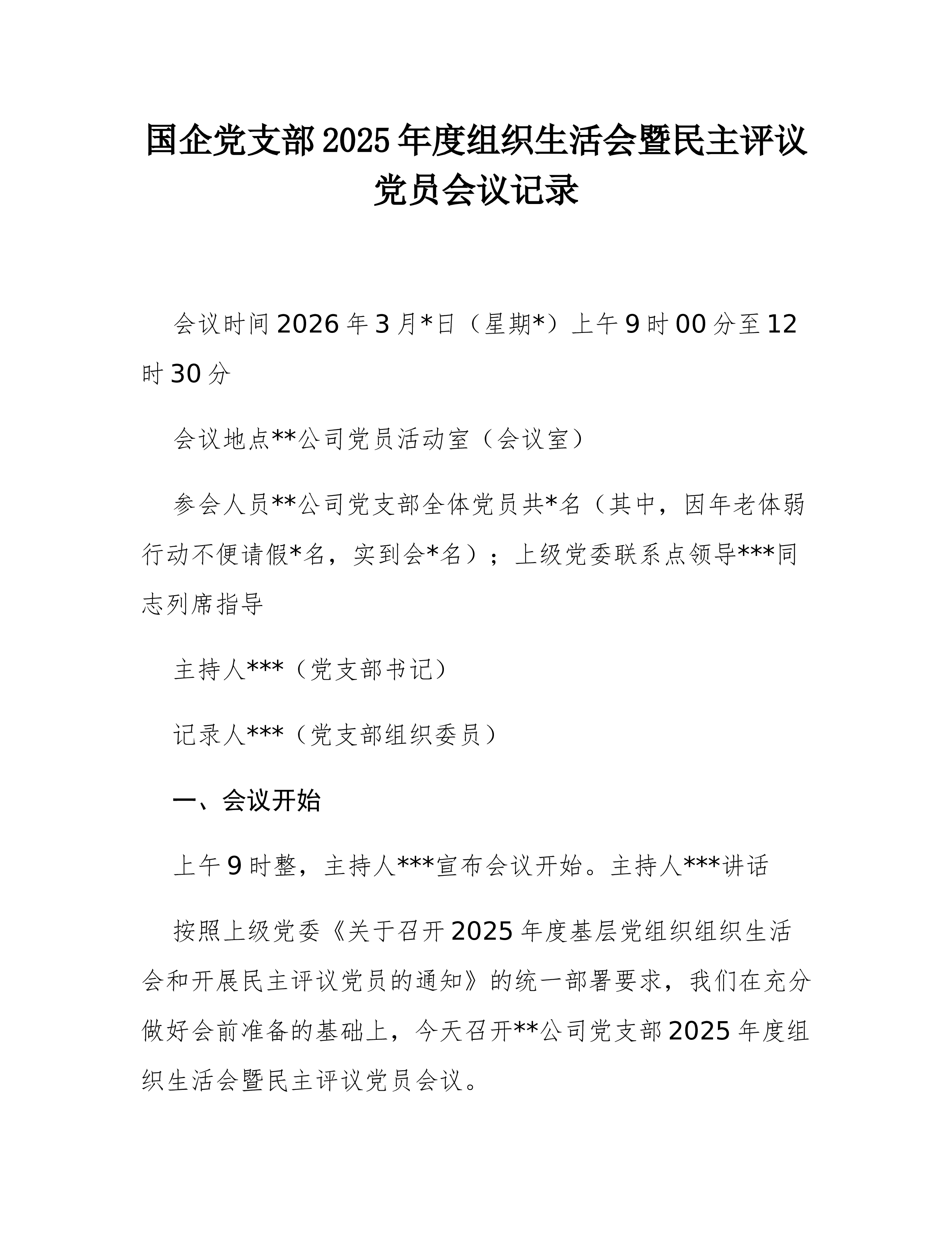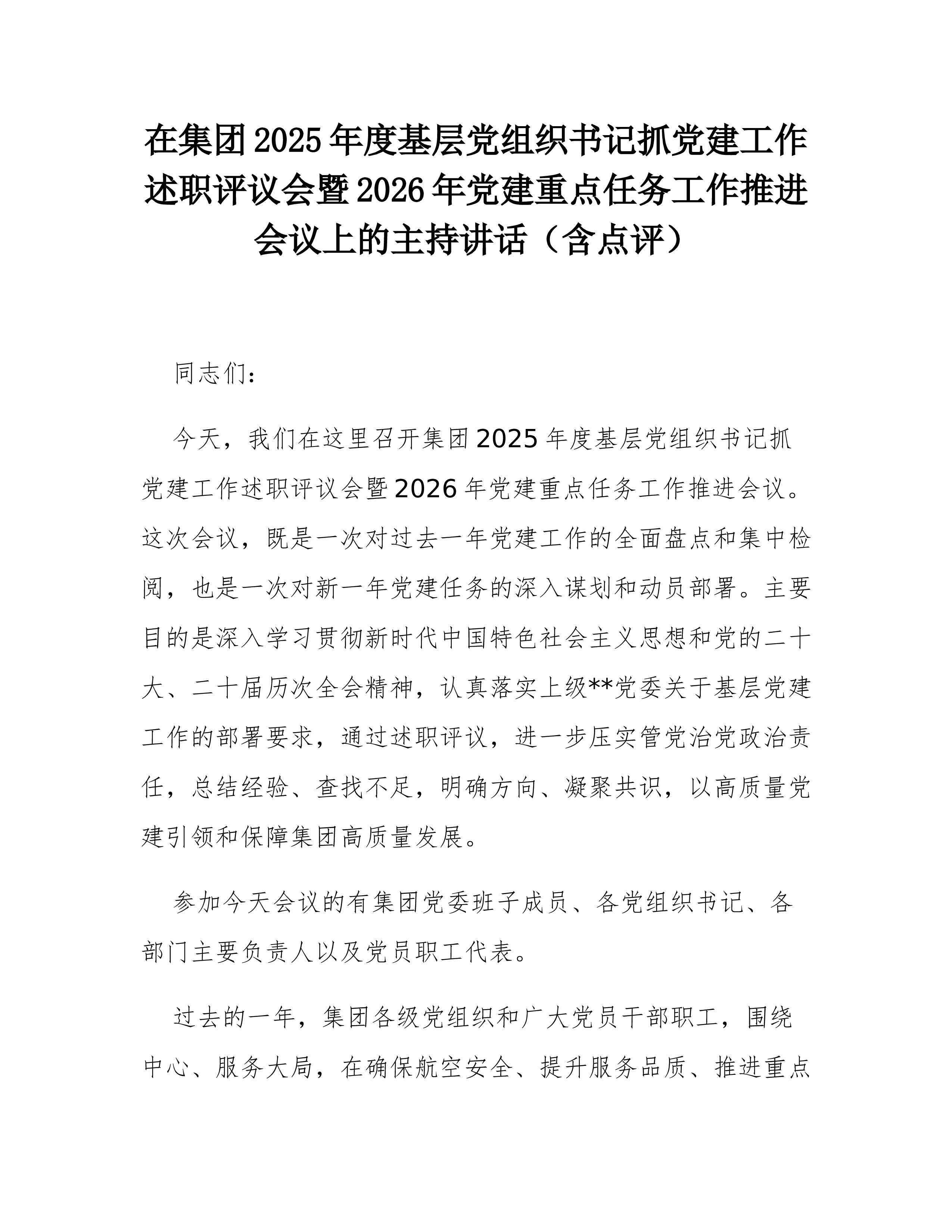 在集团2025年度基层党组织书记抓党建工作述职评议会暨2026年党建重点任务工作推进会议上的主持讲话(含点评)同志们:今天,我们在这里召开集团2025年度基层党组织书记抓党建工作述职评议会暨2026年党建重点任务工作推进会议。这次会议,既是一次对过去一年党建工作的全面盘点和集中检阅,也是一次对新一年党建任务的深入谋划和动员部署。主要目的是深入学习贯彻新时代中国特色社会主义思想和党的二十大、二十届历次全会精神,认真落实上级**党委关于基层党建工作的部署要求,通过述职评议,进一步压实管党治党政治责任,总结经验、查找不足,明确方向、凝聚共识,以高质量党建引领和保障集团高质量发展。参加今天会议的有集团党委班子成员、各党组织书记、各部门主要负责人以及党员职工代表。过去的一年,集团各级党组织和广大党员干...