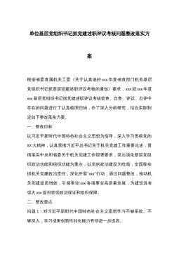 单位基层党组织书记抓党建述职评议考核问题整改落实方案根据省委直属机关工委《关于认真做好xxx年度省直部门机关基层党组织书记抓基层党建述职评议考核的通知》要求,xxx就xxx年度xxx基层党组织书记抓党建述职评议考核督查、自查、评议、点评中存在的问题进行了认真梳理归纳,作了深入分析研究,结合实际制定如下整改落实方案。一、整改目标以习近平新时代中国特色社会主义思想为指导,深入学习贯彻党的XX大精神,认真贯彻习近平总书记关于机关党建工作重要论述,贯彻落实中央和省委关于机关党建工作部署要求,突出强化基层党组织政治功能和组织功能为重点,以党的政治建设为统领,全面靠实抓机关党建政治责任,深化开展“xxx”...