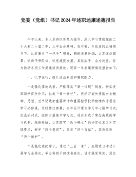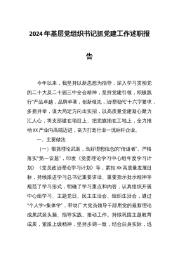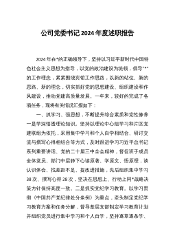 公司党支部书记2024年度落实党建工作责任制述职报告尊敬的各位领导、同志们:大家好!2024年,在上级党组织的正确领导下,我作为公司党支部书记,始终坚持以新时代中国特色社会主义思想为指导,认真履行党建工作第一责任人职责,团结带领公司全体党员干部职工,扎实推进党建各项工作,为公司的稳定发展提供了坚强的政治保障和组织保障。现将本人2024年度落实党建工作责任制情况述职如下:一、主要工作及成效(一)强化政治引领,筑牢思想根基。始终把政治建设摆在首位,教育引导全体党员干部增强“四个意识”、坚定“四个自信”、做到“两个维护”。通过组织党员集中学习、专题研讨、个人自学等多种形式,深入学习贯彻新时代中国特色...