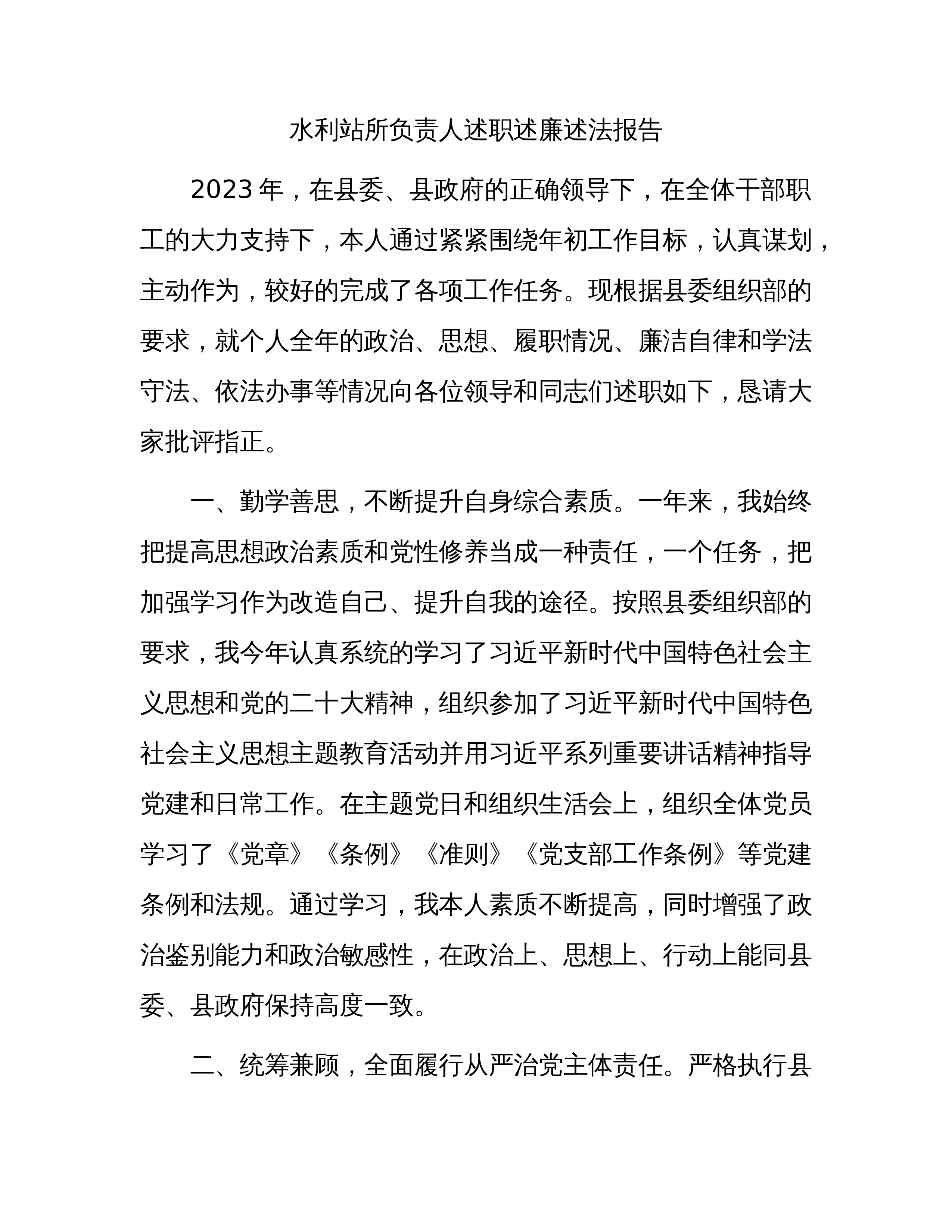 水利站所负责人述职述廉述法报告2023年,在县委、县政府的正确领导下,在全体干部职工的大力支持下,本人通过紧紧围绕年初工作目标,认真谋划,主动作为,较好的完成了各项工作任务。现根据县委组织部的要求,就个人全年的政治、思想、履职情况、廉洁自律和学法守法、依法办事等情况向各位领导和同志们述职如下,恳请大家批评指正。一、勤学善思,不断提升自身综合素质。一年来,我始终把提高思想政治素质和党性修养当成一种责任,一个任务,把加强学习作为改造自己、提升自我的途径。按照县委组织部的要求,我今年认真系统的学习了习近平新时代中国特色社会主义思想和党的二十大精神,组织参加了习近平新时代中国特色社会主义思想主题教育活...