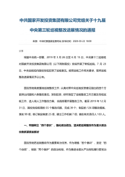 中共国家开发投资集团有限公司党组关于十九届中央第三轮巡视整改进展情况的通报来源:中央纪委国家监委网站发布时间:2020-03-2218:00分享根据中央统一部署,2019年3月26日至6月15日,中央第十二巡视组对国家开发投资集团有限公司(以下简称国投)党组开展了常规巡视。7月23日,中央巡视组向国投党组反馈了巡视意见。按照巡视工作有关要求,现将巡视整改进展情况予以公布。国投党组高度重视巡视整改工作,认真对照中央巡视反馈意见指出的四个方面突出问题和六条整改意见,深刻反思,研究制定了巡视整改工作方案及党组巡视工作、选人用人工作整改方案,全面部署开展整改工作。截至2019年12月31日,国投党组梳...