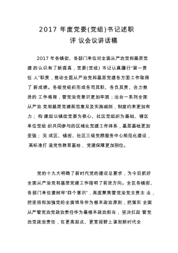 2017年度党组织书记述职评议暨2018年度党委理论学习中心组第一次集中学习会讲话稿同志们:按照中央、省州党委组织部的部署和要求,经院党委研究决定,今天我们召开2017年度党组织书记述职评议暨2018年度党委理论学习中心组第一次集中学习会议,主要任务是认真学习贯彻党的十九大精神和州委八届三次全会精神,履行从严管党治党的政治责任,听取我院各党支部书记2017年度抓党建工作情况述职,了解各党支部抓党建工作情况,分析存在的问题,推动基层党建工作扎实深入开展。参加今天会议的人员有:院党委委员,各党支部书记、支委和部分科主任、党员、职工代表。会议议程主要有四项:一是学习党的十九大精神。二是学习州委八届三...