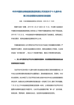 中共中国联合网络通信集团有限公司党组关于十九届中央第三轮巡视整改进展情况的通报来源:中央纪委国家监委网站发布时间:2020-03-2118:00根据中央统一部署,2019年3月27日至6月15日,中央第六巡视组对中国联合网络通信集团有限公司党组(以下简称中国联通党组)开展了常规巡视。2019年7月22日,中央巡视组向中国联通党组反馈了巡视意见。按照巡视工作有关要求,现将巡视整改进展情况予以公布。中国联通党组深入学习贯彻习近平总书记关于巡视工作的重要讲话精神,严格按照中央要求,切实担当巡视整改主体责任,狠抓巡视整改工作落实,扎实做好巡视“后半篇文章”。经过三个月的集中整改,整改工作取得阶段性成效...