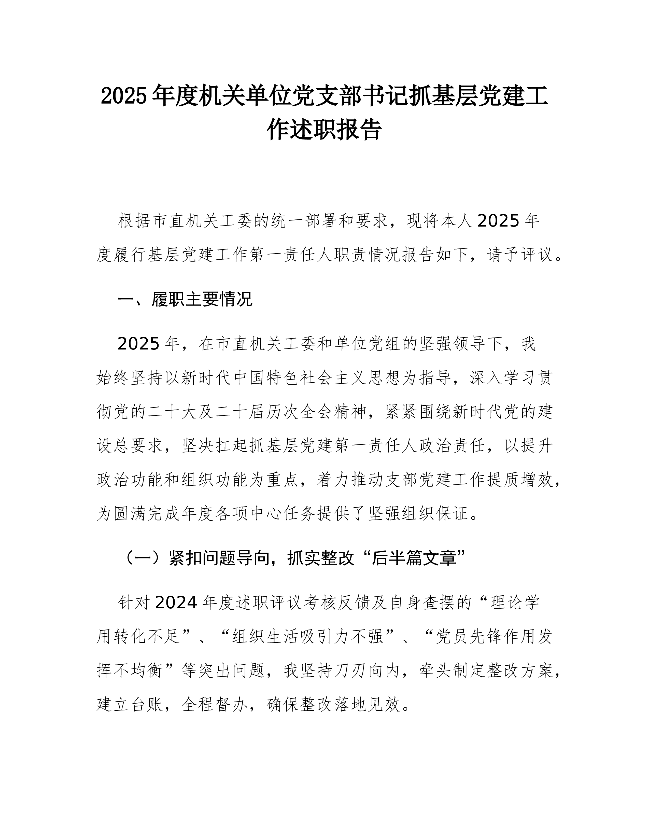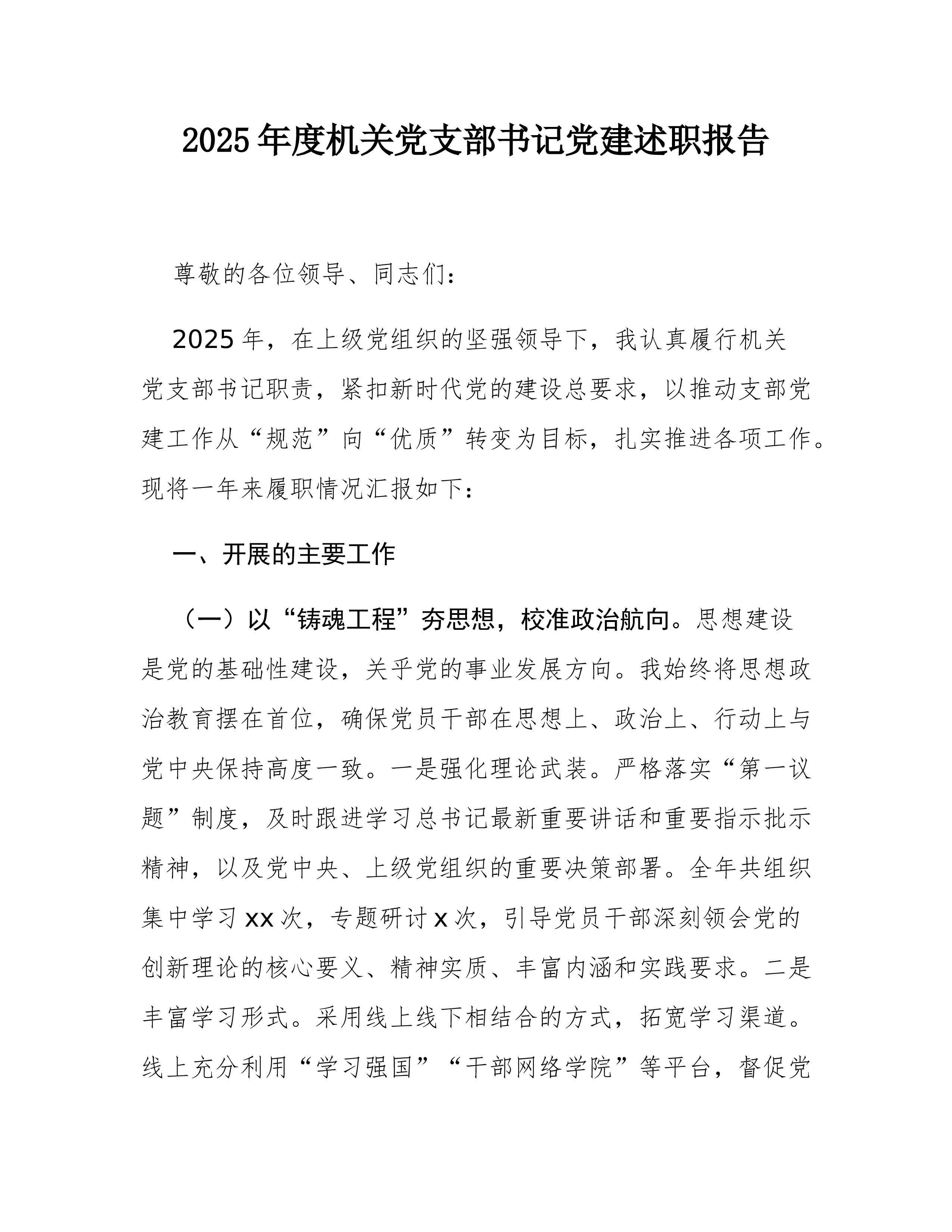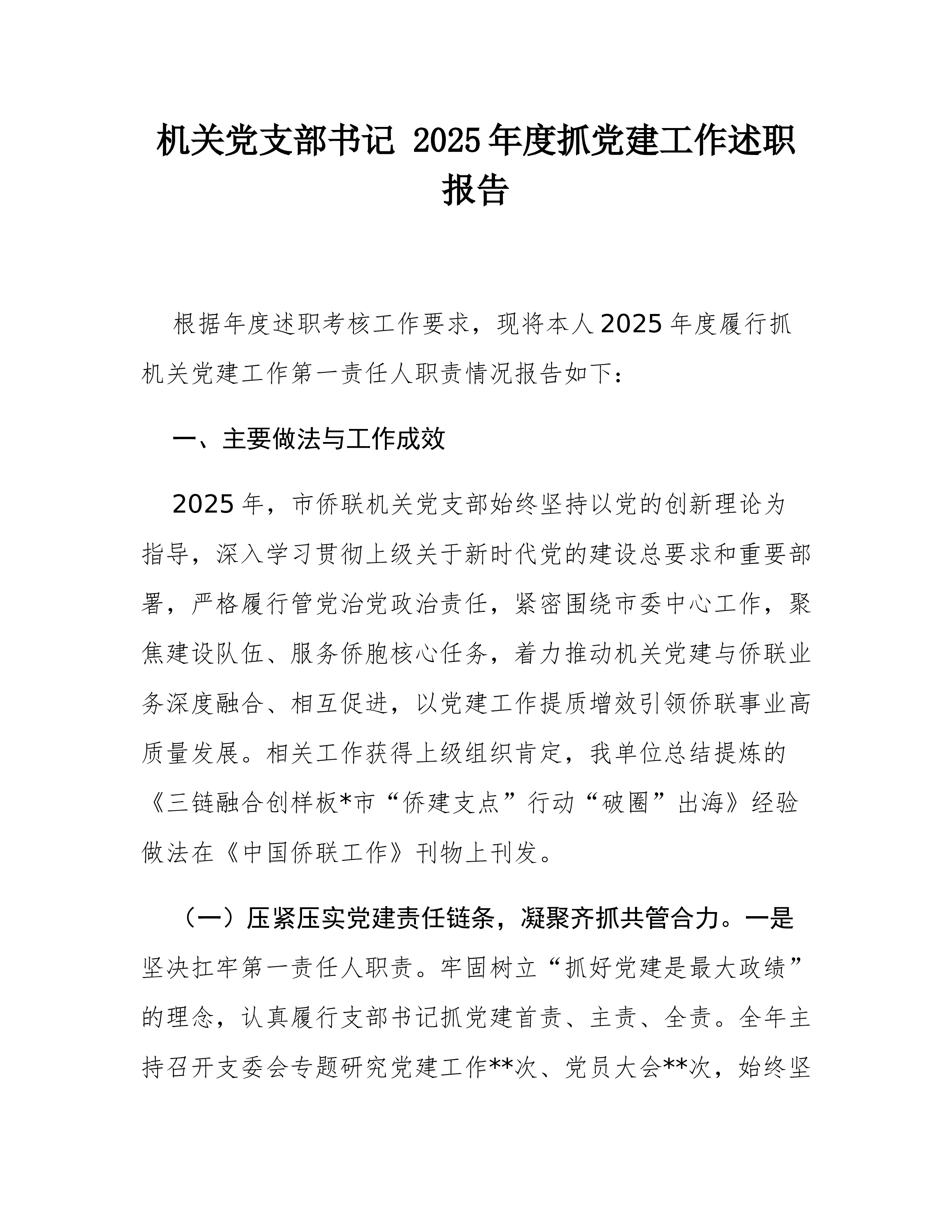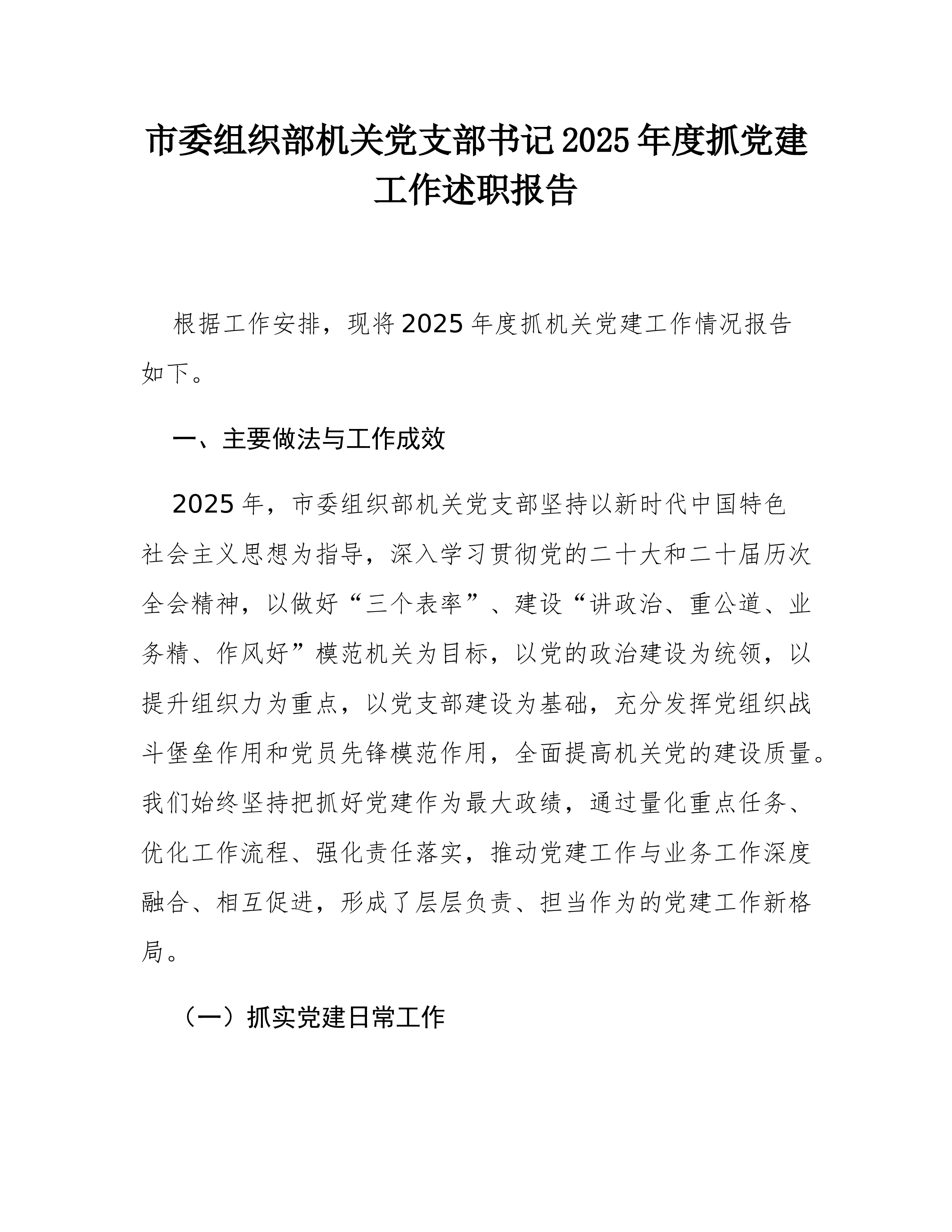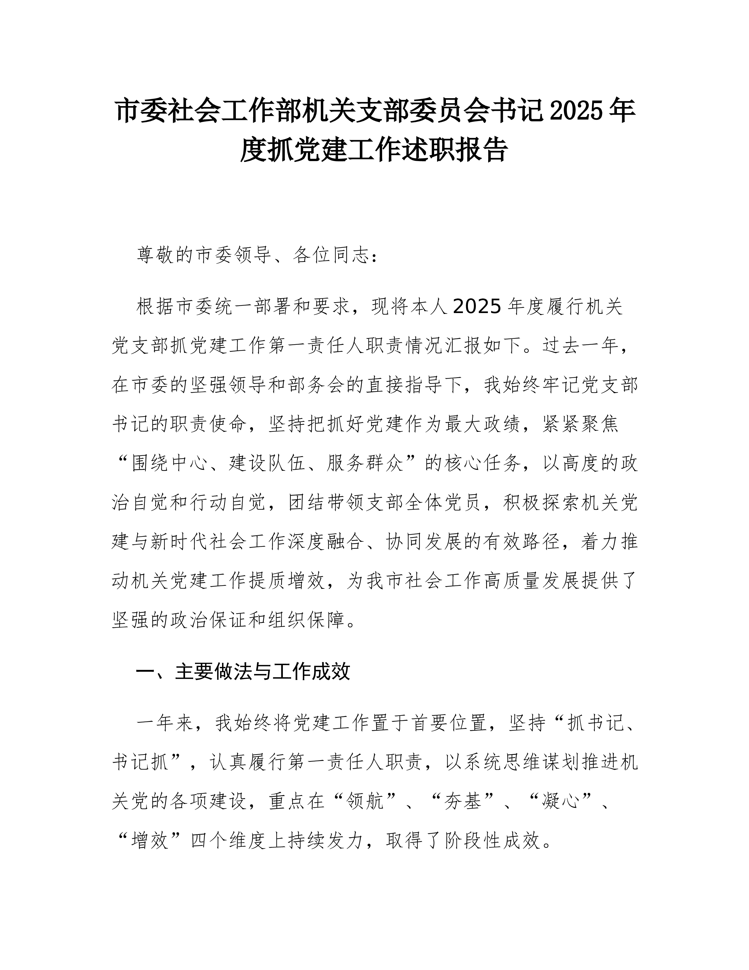 市委社会工作部机关支部委员会书记2025年度抓党建工作述职报告尊敬的市委领导、各位同志:根据市委统一部署和要求,现将本人2025年度履行机关党支部抓党建工作第一责任人职责情况汇报如下。过去一年,在市委的坚强领导和部务会的直接指导下,我始终牢记党支部书记的职责使命,坚持把抓好党建作为最大政绩,紧紧聚焦“围绕中心、建设队伍、服务群众”的核心任务,以高度的政治自觉和行动自觉,团结带领支部全体党员,积极探索机关党建与新时代社会工作深度融合、协同发展的有效路径,着力推动机关党建工作提质增效,为我市社会工作高质量发展提供了坚强的政治保证和组织保障。一、主要做法与工作成效一年来,我始终将党建工作置于首要位置,坚持“抓书记、书记抓”,认真履行第一责任人职责,以系统思维谋划推进机关党的各项建设,重点在“领航”...