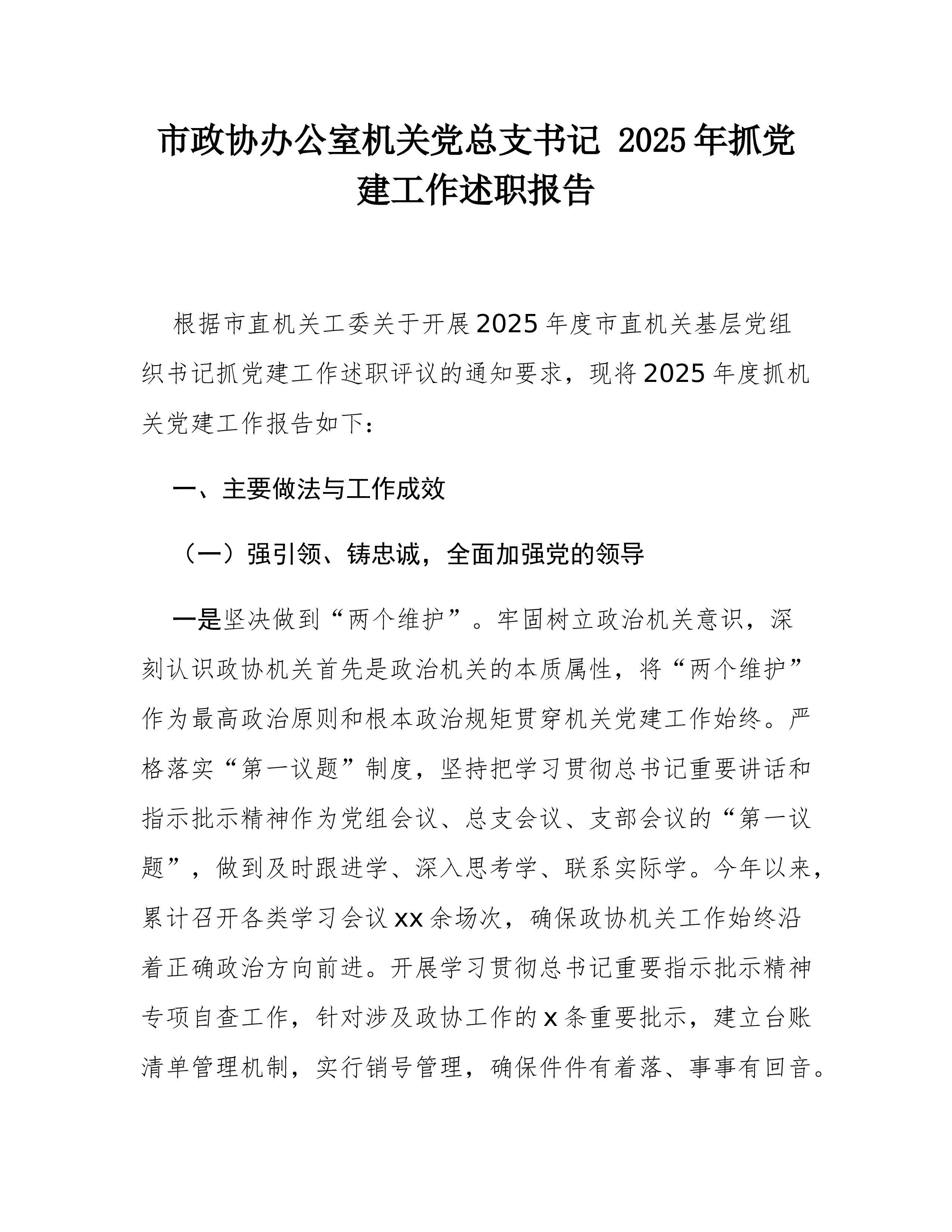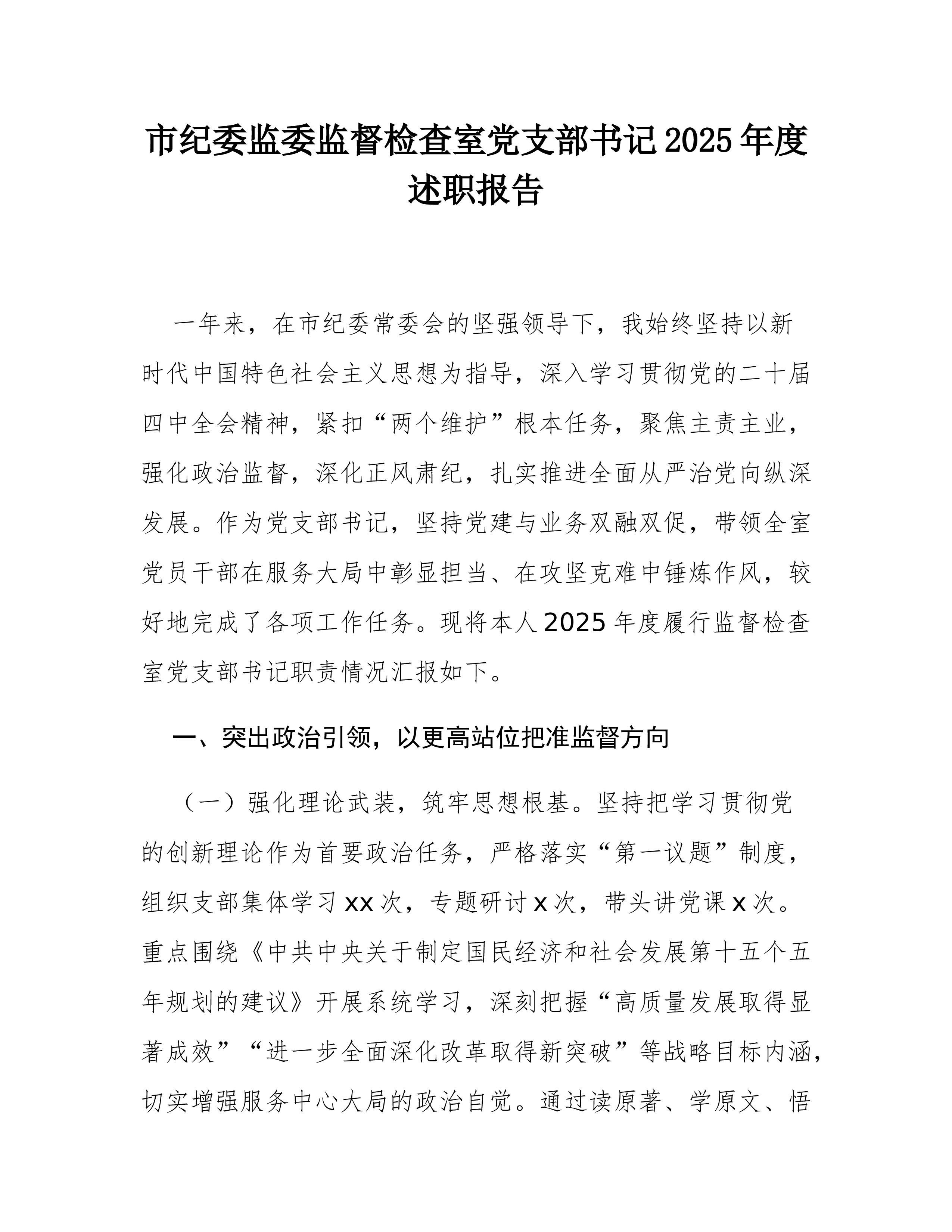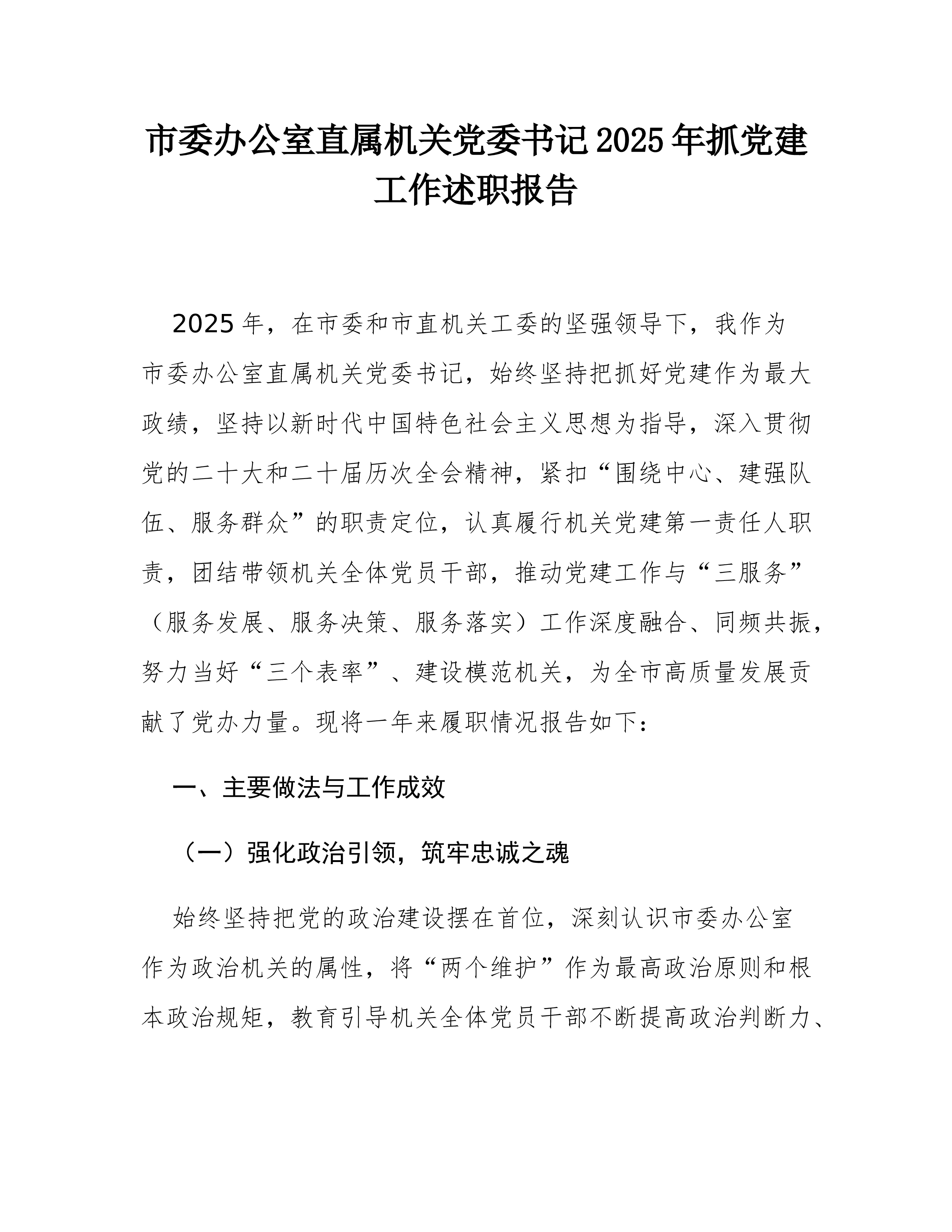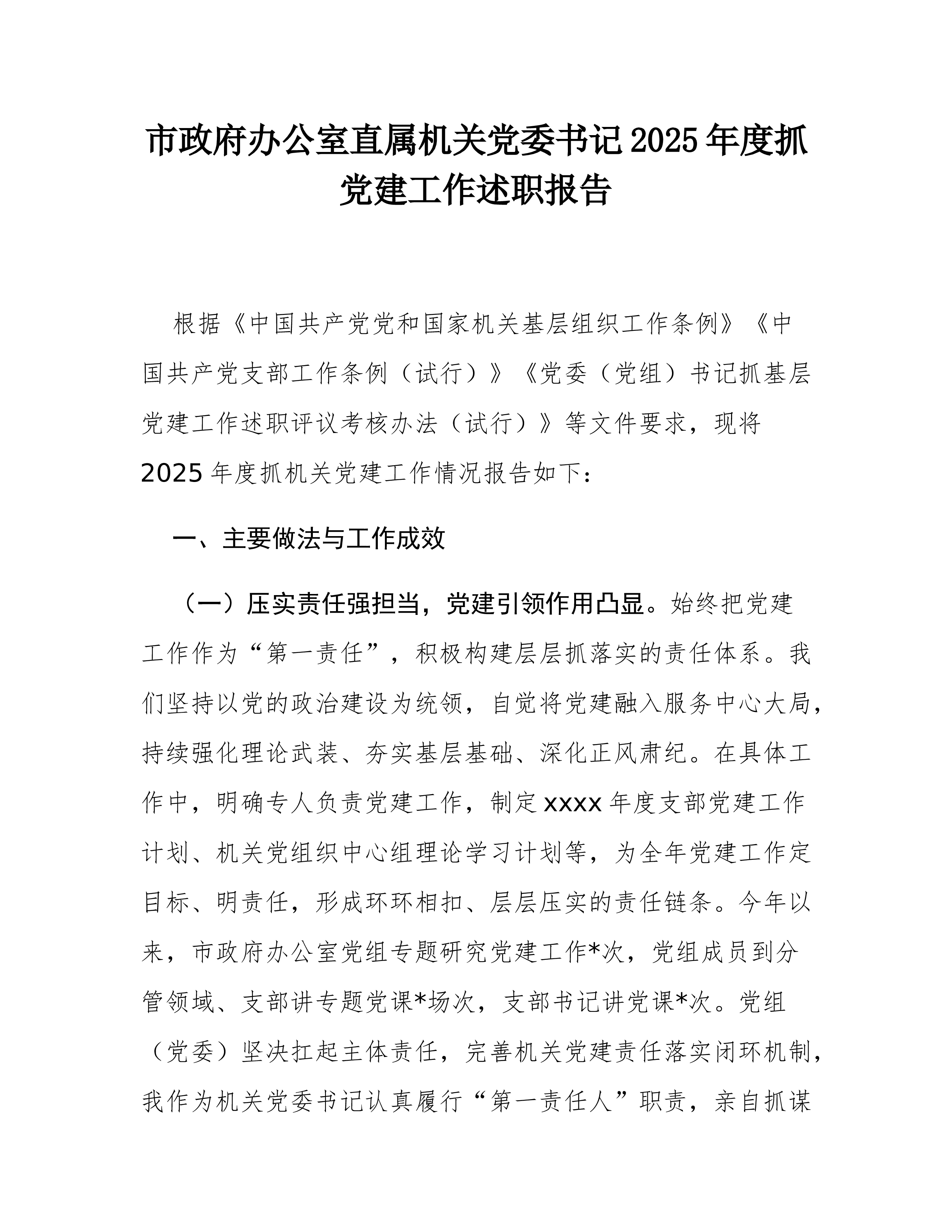 市委社会工作部机关支部委员会书记2025年度抓党建工作述职报告尊敬的市委领导、各位同志:根据市委统一部署和要求,现将本人2025年度履行机关党支部抓党建工作第一责任人职责情况汇报如下。过去一年,在市委的坚强领导和部务会的直接指导下,我始终牢记党支部书记的职责使命,坚持把抓好党建作为最大政绩,紧紧聚焦“围绕中心、建设队伍、服务群众”的核心任务,以高度的政治自觉和行动自觉,团结带领支部全体党员,积极探索机关党建与新时代社会工作深度融合、协同发展的有效路径,着力推动机关党建工作提质增效,为我市社会工作高质量发展提供了坚强的政治保证和组织保障。一、主要做法与工作成效一年来,我始终将党建工作置于首要位置,坚持“抓书记、书记抓”,认真履行第一责任人职责,以系统思维谋划推进机关党的各项建设,重点在“领航”...