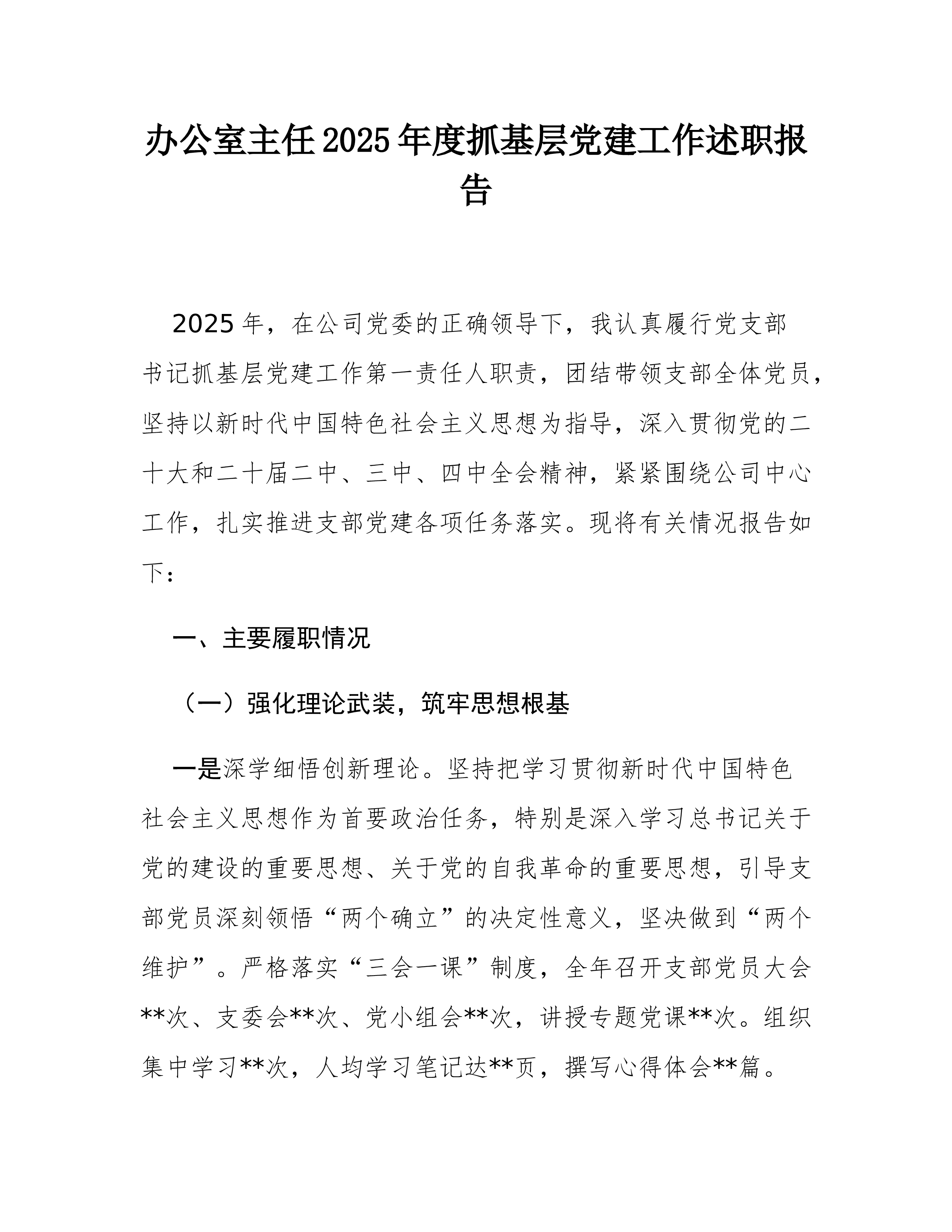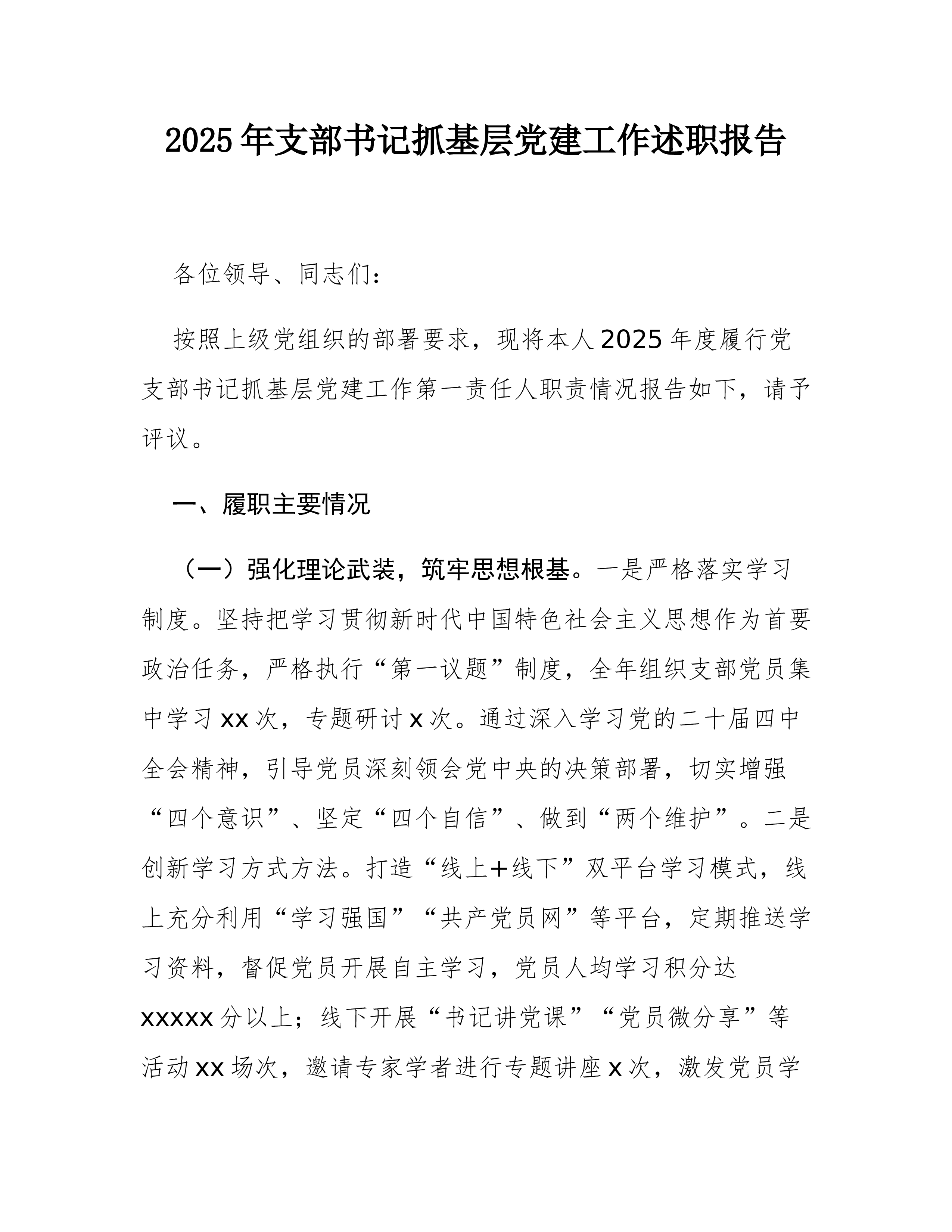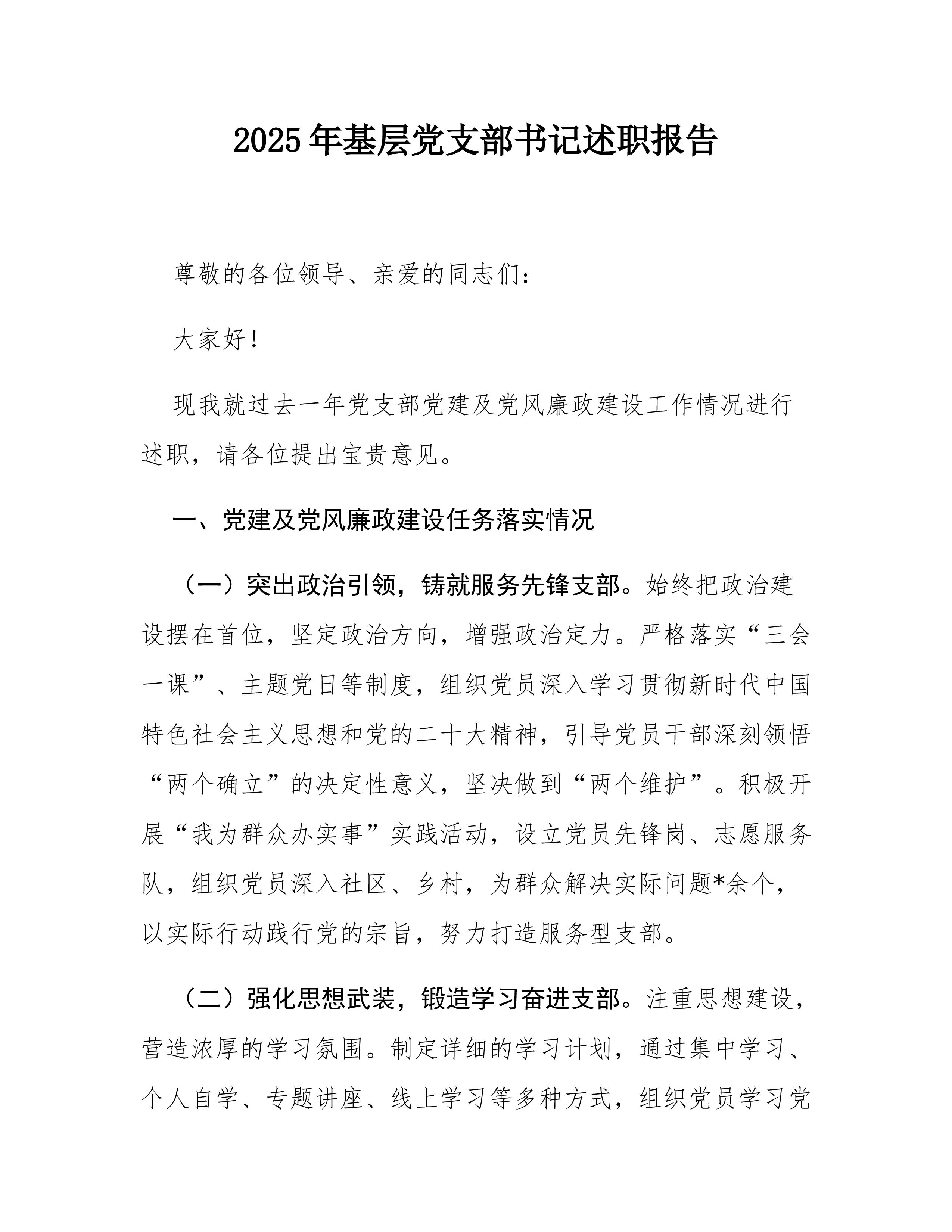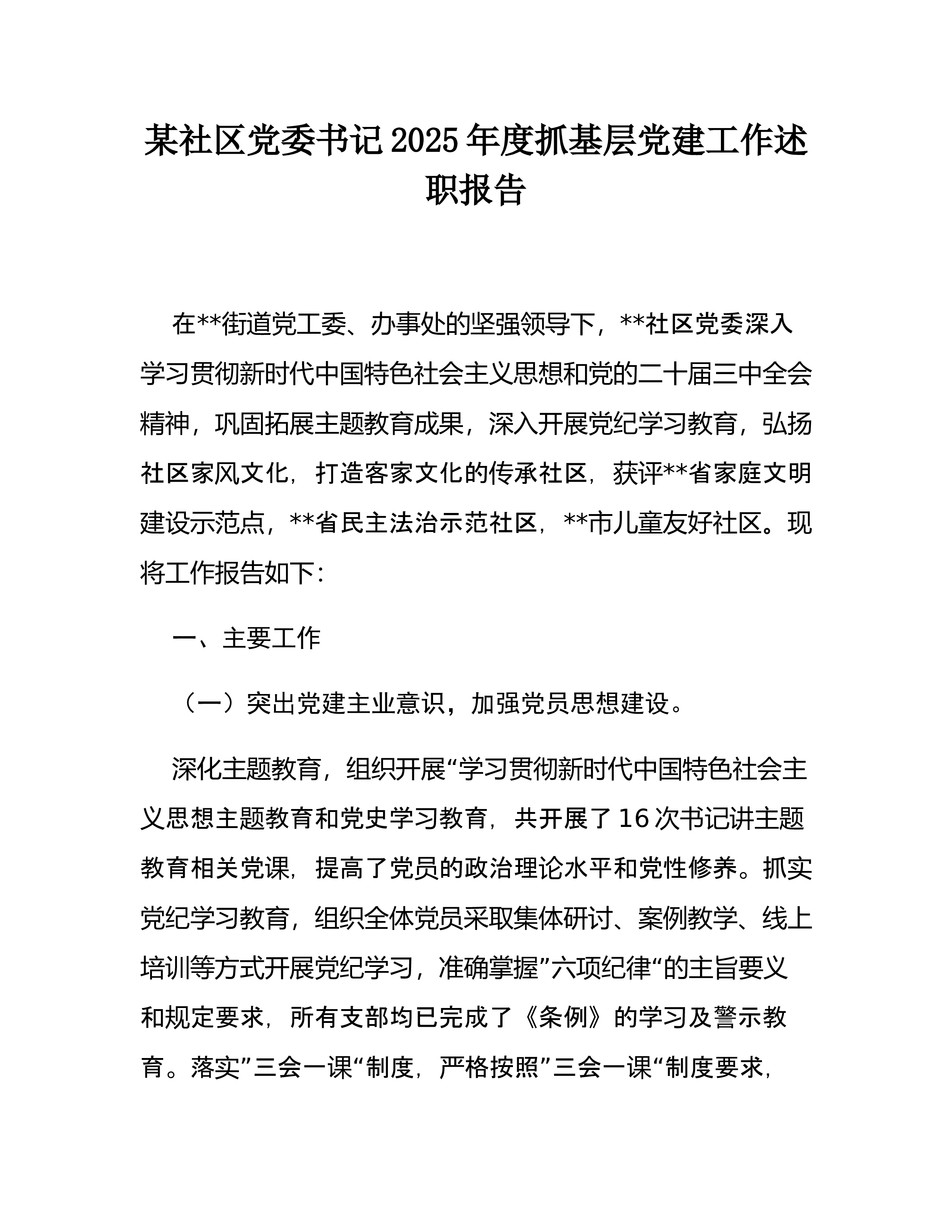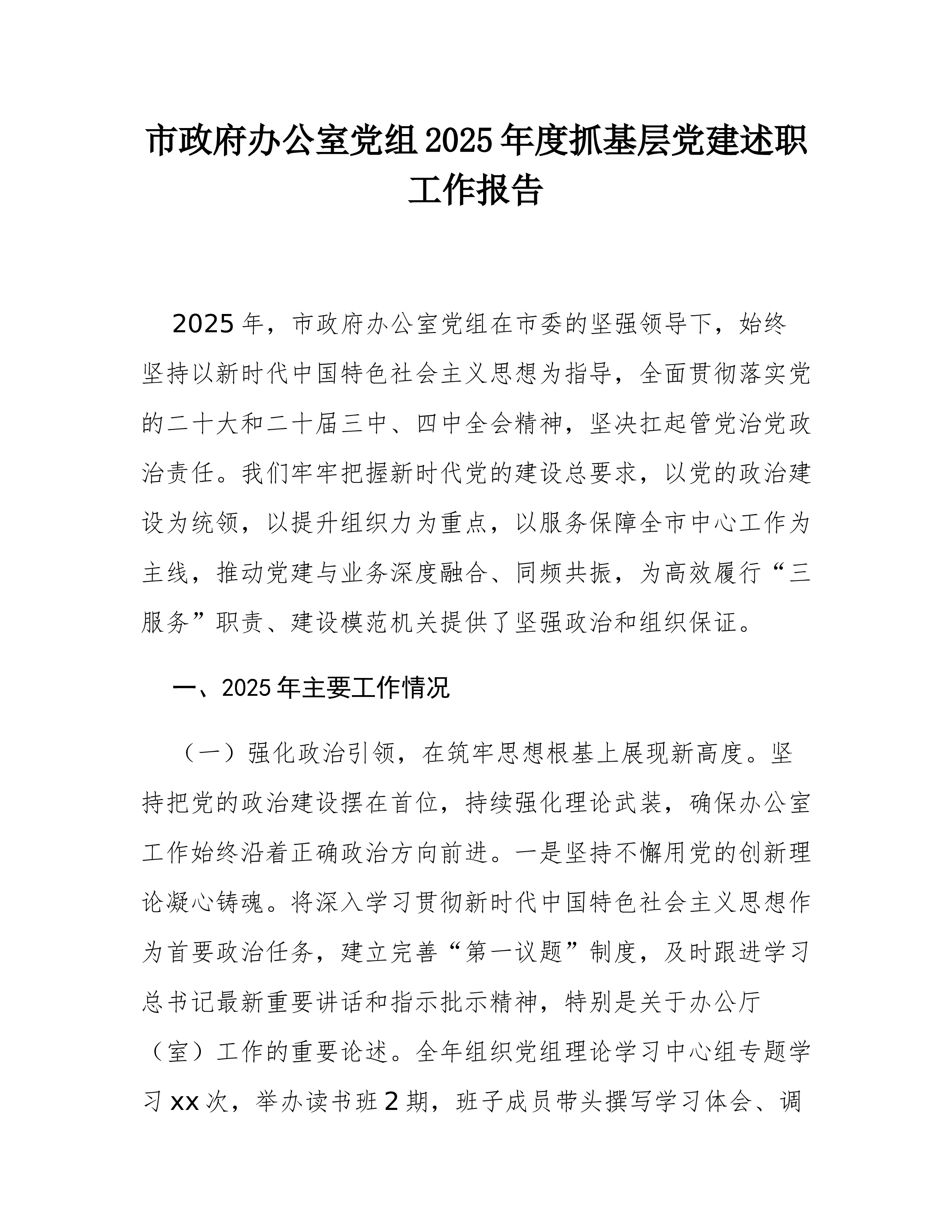 市委社会工作部机关支部委员会书记2025年度抓党建工作述职报告尊敬的市委领导、各位同志:根据市委统一部署和要求,现将本人2025年度履行机关党支部抓党建工作第一责任人职责情况汇报如下。过去一年,在市委的坚强领导和部务会的直接指导下,我始终牢记党支部书记的职责使命,坚持把抓好党建作为最大政绩,紧紧聚焦“围绕中心、建设队伍、服务群众”的核心任务,以高度的政治自觉和行动自觉,团结带领支部全体党员,积极探索机关党建与新时代社会工作深度融合、协同发展的有效路径,着力推动机关党建工作提质增效,为我市社会工作高质量发展提供了坚强的政治保证和组织保障。一、主要做法与工作成效一年来,我始终将党建工作置于首要位置,坚持“抓书记、书记抓”,认真履行第一责任人职责,以系统思维谋划推进机关党的各项建设,重点在“领航”...