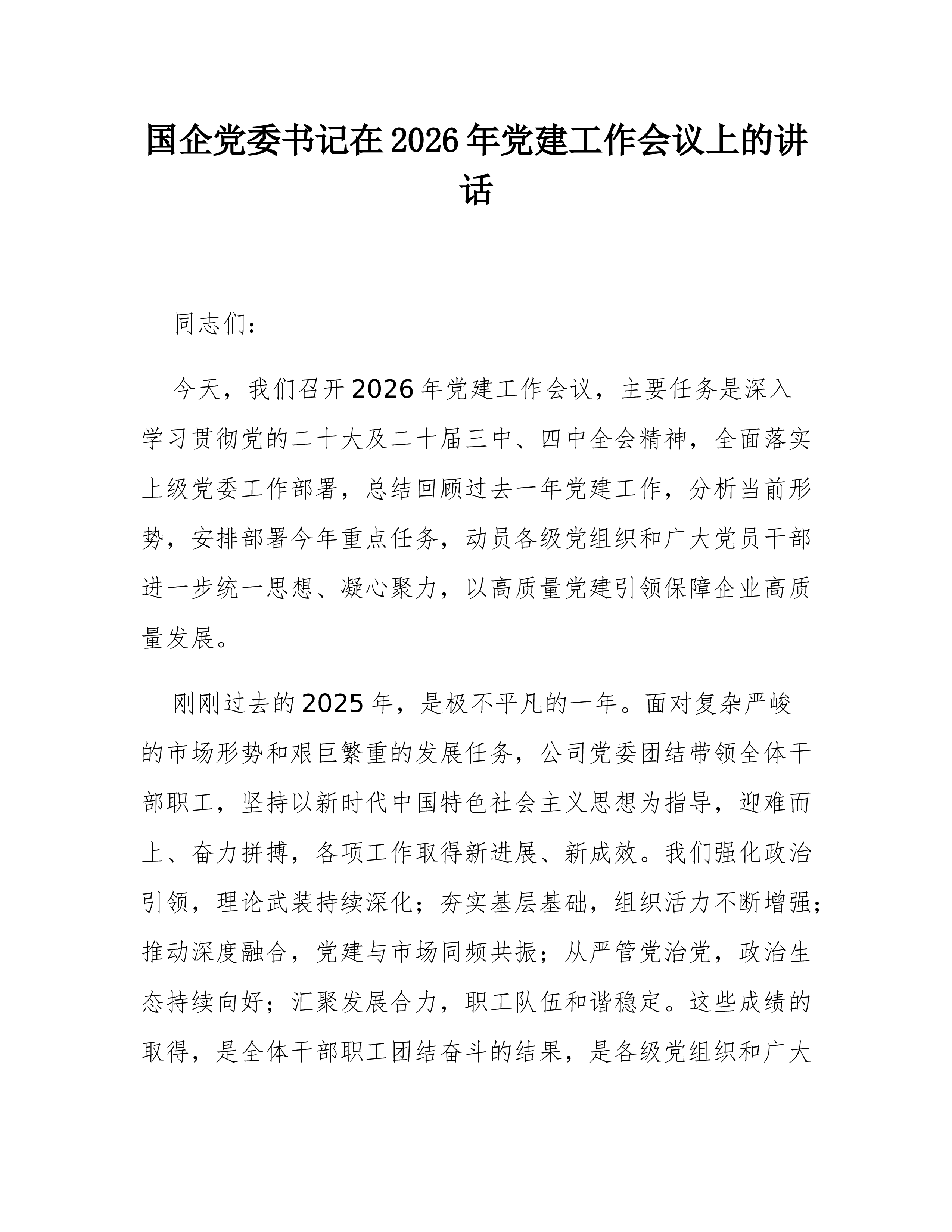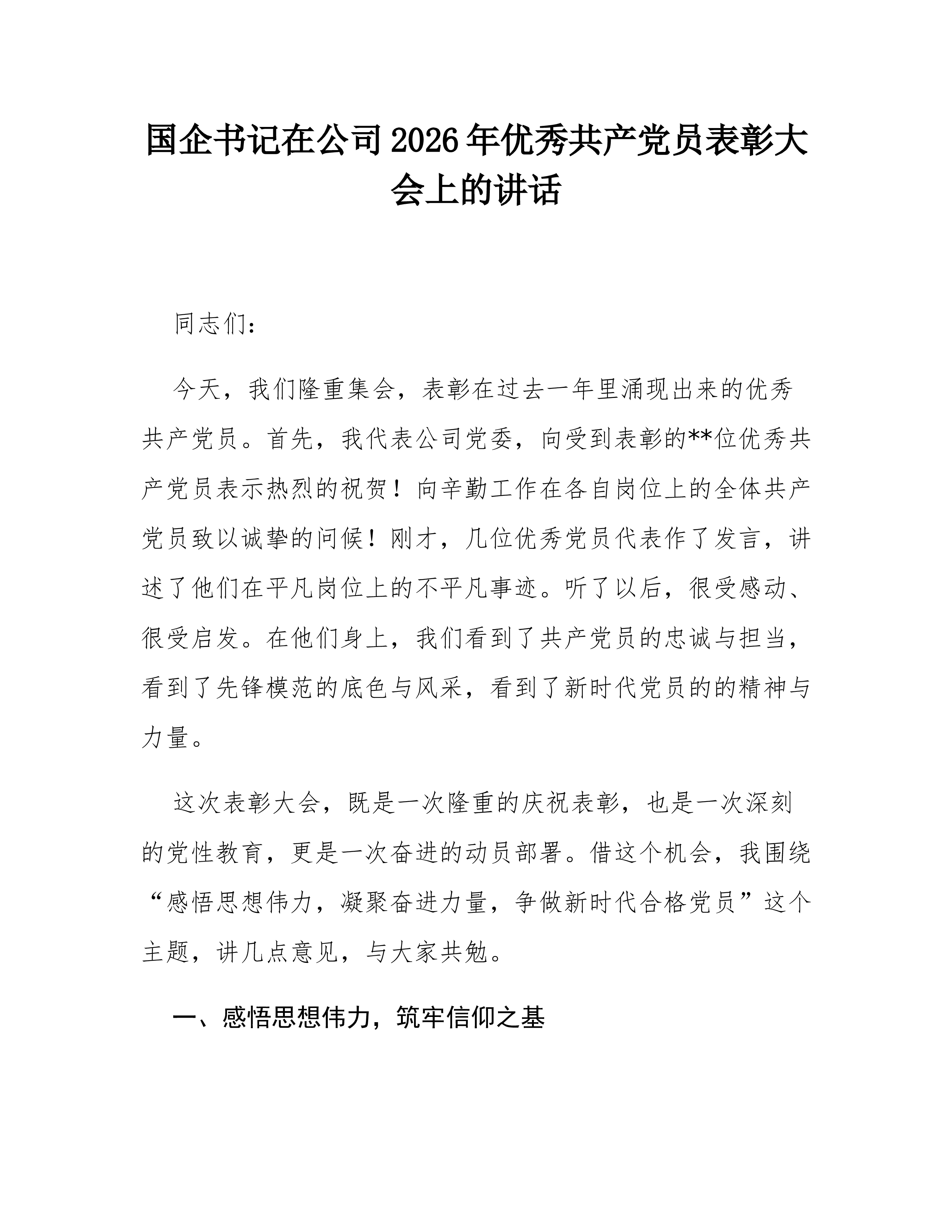 国企书记在公司2026年优秀共产党员表彰大会上的讲话同志们:今天,我们隆重集会,表彰在过去一年里涌现出来的优秀共产党员。首先,我代表公司党委,向受到表彰的**位优秀共产党员表示热烈的祝贺!向辛勤工作在各自岗位上的全体共产党员致以诚挚的问候!刚才,几位优秀党员代表作了发言,讲述了他们在平凡岗位上的不平凡事迹。听了以后,很受感动、很受启发。在他们身上,我们看到了共产党员的忠诚与担当,看到了先锋模范的底色与风采,看到了新时代党员的的精神与力量。这次表彰大会,既是一次隆重的庆祝表彰,也是一次深刻的党性教育,更是一次奋进的动员部署。借这个机会,我围绕“感悟思想伟力,凝聚奋进力量,争做新时代合格党员”这个主题,讲几点意见,与大家共勉。一、感悟思想伟力,筑牢信仰之基思想是行动的先导,理论是实践的指南。我们...