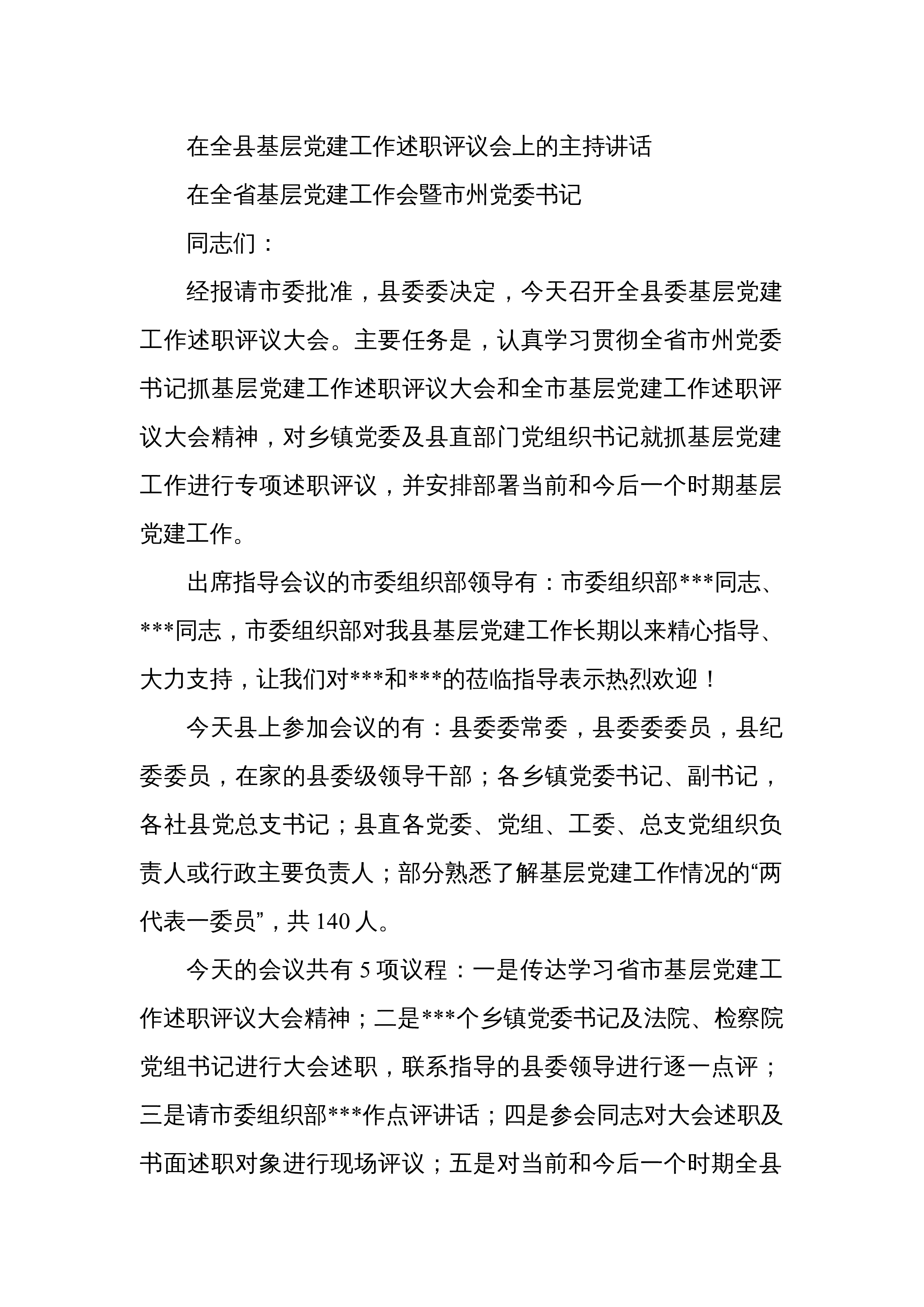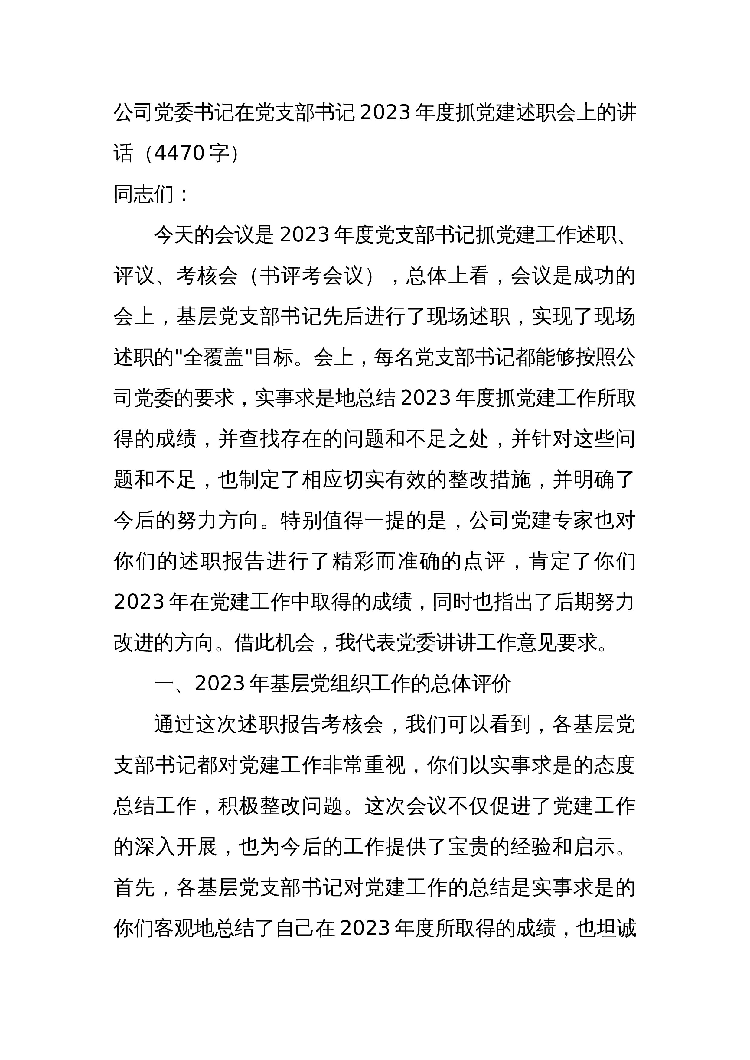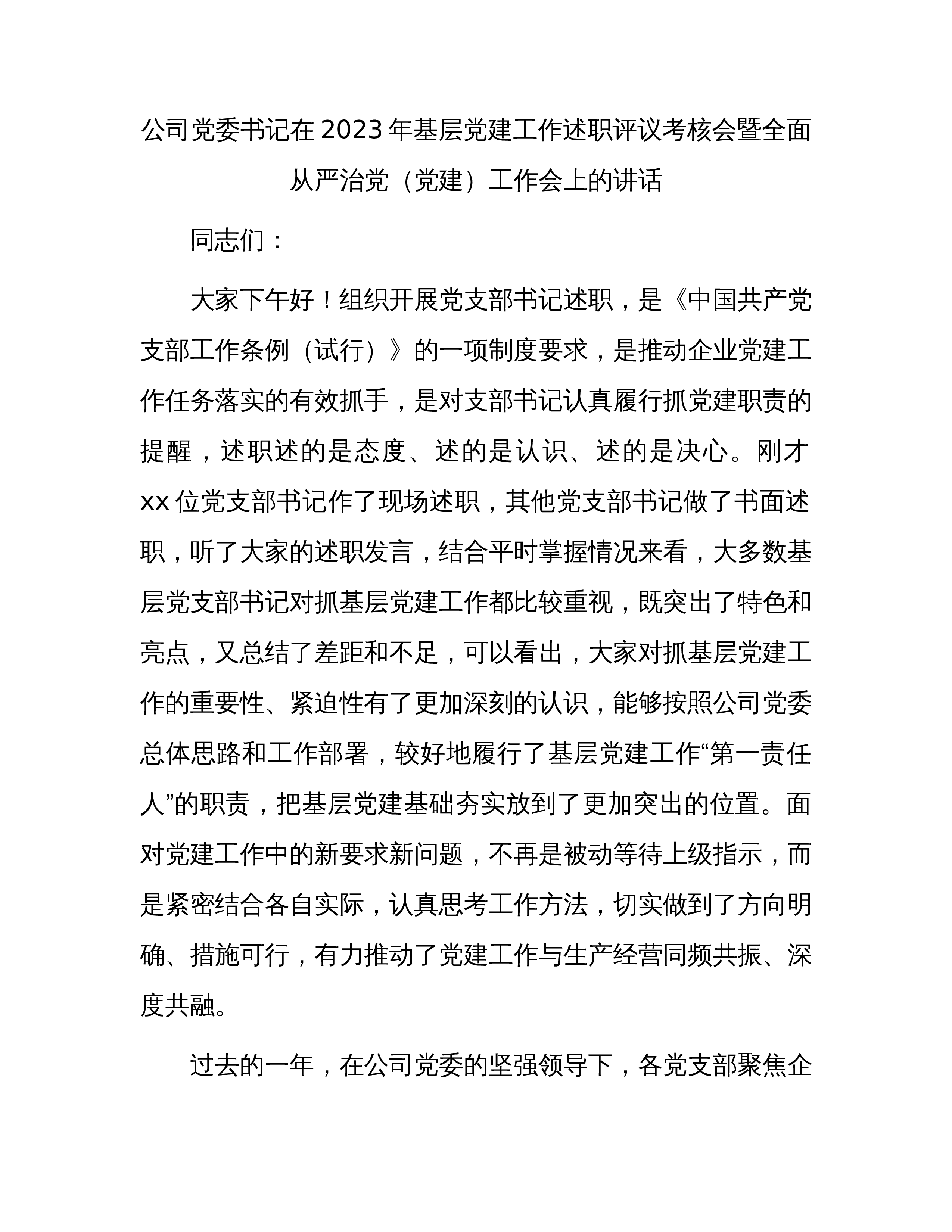 公司党委书记在2023年基层党建工作述职评议考核会暨全面从严治党(党建)工作会上的讲话同志们:大家下午好!组织开展党支部书记述职,是《中国共产党支部工作条例(试行)》的一项制度要求,是推动企业党建工作任务落实的有效抓手,是对支部书记认真履行抓党建职责的提醒,述职述的是态度、述的是认识、述的是决心。刚才xx位党支部书记作了现场述职,其他党支部书记做了书面述职,听了大家的述职发言,结合平时掌握情况来看,大多数基层党支部书记对抓基层党建工作都比较重视,既突出了特色和亮点,又总结了差距和不足,可以看出,大家对抓基层党建工作的重要性、紧迫性有了更加深刻的认识,能够按照公司党委总体思路和工作部署,较好地履...