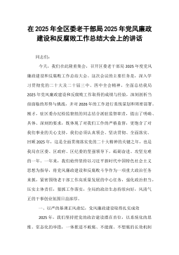 在2025年全区委老干部局2025年党风廉政建设和反腐败工作总结大会上的讲话同志们:今天,我们在此隆重集会,召开区委老干部局2025年度党风廉政建设和反腐败工作总结大会。这次会议的主要任务是,深入学习贯彻党的二十大及二十届三中、四中全会精神,全面总结我局2025年党风廉政建设和反腐败工作取得的成绩与经验,深刻剖析当前面临的形势与挑战,并对2026年的工作进行系统谋划和周密部署。刚才,驻区委办纪检监察组的同志结合派驻监督职责,提出了明确、具体、深刻的要求,既体现了对我们工作的严格监督,更饱含了对我们事业的关心支持,我们必须认真领会、坚决贯彻、全面落实。回顾2025年,这是全面贯彻落实党的二十大精神的关键之年,也是我局在区委、区政府、区纪委的坚强领导下,砥砺奋进、攻坚克难的一年。一年来,我们始终...