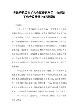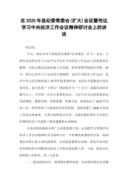 在2025年县纪委常委会(扩大)会议暨传达学习中央经济工作会议精神研讨会上的讲话同志们:今天,我们召开十四届县纪委第*次常委会(扩大)会议,主要任务是传达学习习近平总书记在中央经济工作会议上的重要讲话精神,并结合我县纪检监察工作实际,研究部署贯彻落实举措。刚才,我们已经学习了会议的主要精神。这次中央经济工作会议,是在中华人民共和国成立76周年的重要时刻,也是在全面推进中国式现代化、奋力实现“十四五”规划收官与“十五五”谋篇布局的关键节点上,召开的一次至关重要的会议。习近平总书记的重要讲话,高屋建瓴、视野宏阔,思想深邃、内涵丰富,深刻总结了2025年经济工作,科学研判了当前国内外经济形势,系统部署了2026年经济工作的总体要求、主要目标和重点任务,为我们做好明年乃至更长时期的经济工作提供了根本...
