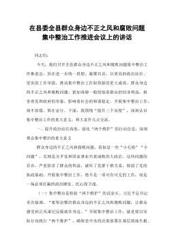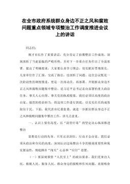 在全市政府系统群众身边不正之风和腐败问题重点领域专项整治工作调度推进会议上的讲话同志们:刚才市长作了重要讲话,充分肯定了前期整治工作成效,深刻剖析了当前面临的严峻形势,并对下一步重点任务作出了全面部署、提出了明确要求,大家要认真学习领会,切实抓好贯彻落实。几家单位作了汇报,交流了做法,也剖析了问题。这次会议既是一次阶段性的调度推进,更是一次再动员、再部署。开展群众身边不正之风和腐败问题集中整治,是习近平总书记亲自部署的重大政治任务,事关人心向背,事关党的执政根基。我们必须以高度的政治自觉、强烈的使命担当,将这项工作进行到底,以实实在在的成效取信于民。下面,我代表市纪委监委,就进一步抓好群众身边不正之风和腐败问题集中整治工作,讲几点意见。一、认识上要有高度,以“刮骨疗毒”的坚定决心纵深推进整治...