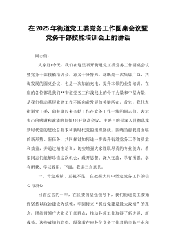 在2025年街道党工委党务工作圆桌会议暨党务干部技能培训会上的讲话同志们:大家好!今天,我们在这里召开街道党工委党务工作圆桌会议暨党务干部技能培训会,意义十分特殊。这既是一次集思广益、共谋发展的圆桌会议,也是一次加油充电、提升本领的业务培训。在座的各位都是我们**街道党务工作战线上的骨干力量和中坚力量,是我们推动基层党建工作不断向前发展的关键所在。首先,我代表街道党工委,向长期以来辛勤工作在党务工作一线的同志们,表示衷心的感谢和诚挚的问候!召开这次会议,主要目的是深入贯彻落实新时代党的建设总要求和新时代党的组织路线,围绕当前我们面临的新形势、新任务,共同探讨如何进一步提升街道党务工作的质量和效益,并通过精准培训,切实增强大家履职尽责的专业能力。希望同志们能够珍惜这次机会,敞开思想、深入交流,...