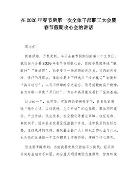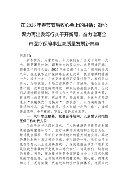 在2026年春节节后收心会上的讲话:凝心聚力再出发笃行实干开新局,奋力谱写全市医疗保障事业高质量发展新篇章同志们:新春伊始,万象更新。今天我们召开全局干部职工大会,既是团结鼓劲、调整状态的收心会,也是明确目标、部署工作的动员会。2026年是实施“十五五”规划的开局之年,也是我市医疗保障事业深化改革、提质增效的重要一年。过去一年,在市委市政府的坚强领导下,我们同心协力、攻坚克难,各项工作取得了扎实进展,基金运行总体平稳,改革效能持续释放,群众获得感稳步提升。但我们必须清醒认识到,医保工作关乎民生底线和发展大局,新征程上任务更重、挑战更多、要求更高。全体同志要迅速从“假期模式”切换到“工作状态”,以饱满的热情、昂扬的斗志、实干的作风,投入到新一年的工作中,确保开局漂亮、全年精彩。下面,我讲三点意...