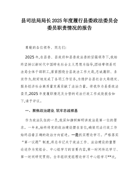 县司法局局长2025年度履行县委政法委员会委员职责情况的报告尊敬的各位领导、同志们:2025年,在县委、县政府和县委政法委的坚强领导下,我始终坚持以新时代中国特色社会主义思想为指导,团结带领县司法局全体干部职工,紧紧围绕全县政法工作大局,忠诚履职、务实作为,较好地完成了各项工作任务,为维护全县社会大局稳定、服务经济社会高质量发展贡献了法治力量。将我作为县委政法委员,2025年度履职情况及分管的司法行政工作成效报告如下,请予评议。一、聚焦政治建设,筑牢忠诚根基作为政法队伍的一员,我深知旗帜鲜明讲政治是第一位的要求。一年来,始终将党的政治建设摆在首位,确保司法行政工作始终沿着正确的政治方向前进。一是抓实理论学习。严格落实“第一议题”制度,将总书记关于政法工作、法治建设的重要论述作为党组会、中心组...