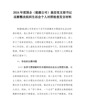 2024年度国企(能源公司)基层党支部书记巡察整改组织生活会个人对照检查发言材料根据*能源公司党委关于召开巡察整改专题组织生活会的通知要求,我认真学习了新时代中国特色社会主义思想和党的二十大精神,特别是关于巡视巡察工作的系列重要论述,深入学习了党章党规党纪,对照巡察反馈意见,紧密联系个人思想和工作实际,深入查找自身存在的差距和不足,深刻剖析问题根源,明确了今后的努力方向和改进措施。现将个人对照检查情况汇报如下:一、存在的主要问题(一)在学习贯彻新时代中国特色社会主义思想方面。能够认真学习新时代中国特色社会主义思想,特别是关于能源安全新战略的论述,但学习的系统性、深入性还不够,存在实用主义倾向,...