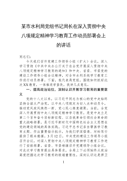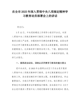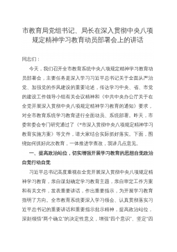 市教育局党组书记、局长在深入贯彻中央八项规定精神学习教育动员部署会上的讲话同志们:今天,我们召开全市教育系统中央八项规定精神学习教育动员部署会,主要任务是深入学习习近平总书记关于全面从严治党、加强党的作风建设的重要论述,传达学习中央、省、市党的建设工作领导小组有关会议精神和《中共中央办公厅关于在全党开展深入贯彻中央八项规定精神学习教育的通知》要求,对全市教育系统学习教育进行全面动员、系统部署。昨天,市委常委会专门研究通过了《*市深入贯彻中央八项规定精神学习教育实施方案》等文件,请大家结合实际抓好落实。下面,围绕如何抓好此次教育,一体推进学查改,我讲几点意见。一、提高政治站位,切实增强开展学习教...