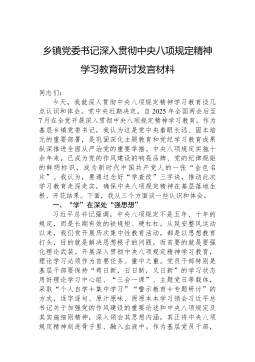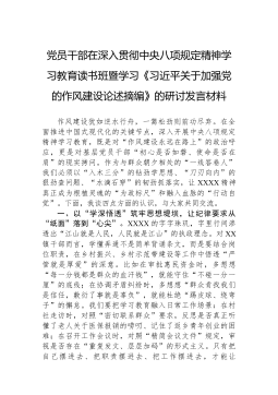 党员干部在深入贯彻中央八项规定精神学习教育读书班暨学习《习近平关于加强党的作风建设论述摘编》的研讨发言材料作风建设犹如逆水行舟,一篙松劲则前功尽弃。在全面推进中国式现代化的关键节点,深入开展中央八项规定精神学习教育,既是对“作风建设永远在路上”的政治呼应,更是对基层党员干部“初心是否如磐、使命是否在肩”的现实拷问。作为与群众朝夕相处的“一线答卷人”我们必须以“入木三分”的钻劲学思想、“刀刃向内”的狠劲查问题、“水滴石穿”的韧劲抓落实,让XXXX精神真正成为根植灵魂的“为政标尺”和融入血脉的“行动自觉”。下面,我谈四点方面的认识,与大家共同交流。一、以“学深悟透”筑牢思想堤坝,让纪律要求从“纸面”落到“心尖”。XXXX的字字珠玑,字里行间渗透出“江山就是人民,人民就是江山”的执政理念。对XX镇...