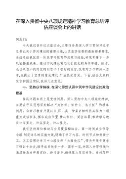 在深入贯彻中央八项规定精神学习教育总结评估座谈会上的讲话同志们:今天我们召开这次座谈会,主要任务是深入学习贯彻习近平总书记关于作风建设的重要论述,认真落实省委的最新部署要求,系统总结我区前一阶段学习教育的成效与经验,研究部署下一步巩固拓展成果、推动作风建设常态化长效化的具体举措。刚才,几位来自不同岗位的同志作了很好的发言,既有对工作的深入思考,也提出了宝贵的意见建议,听后很受启发。下面,结合大家的发言和园区实际,我讲几点意见。一、坚持以学铸魂,在深化思想认识中筑牢作风建设的政治根基作风问题本质上是党性问题。深入贯彻中央八项规定精神,首要在于从思想深处解决“为何抓、抓什么、怎么抓”的根本问题。自学习教育开展以来,区工委、管委会始终将其作为一项重大政治任务,摆在突出位置,精心组织、周密部署,推动...